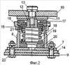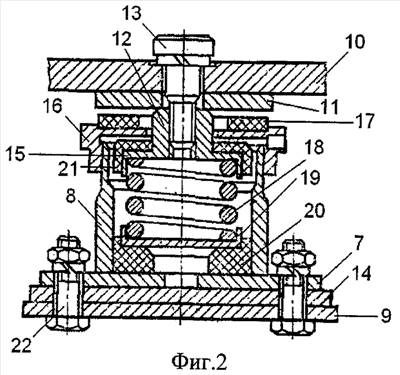 Система виброизоляции для судовых двигателей работает следующим образом. При колебаниях виброизолируемого объекта, установленного на опорном каркасе 3, пружина 18 воспринимает вертикальные нагрузки, ослабляя тем самым динамическое воздействие на перекрытия и перегородки каркаса судна. Нелинейное демпфирование в системе осуществляется за счет наличия нижнего 20 и верхнего 21 ограничителей хода пружины 18, выполненных из эластомера. Горизонтальные колебания гасятся за счет нестесненного (с зазором) расположения нижнего опорного стакана 19 пружины 18 и верхней охватывающей пружину крышки 15.