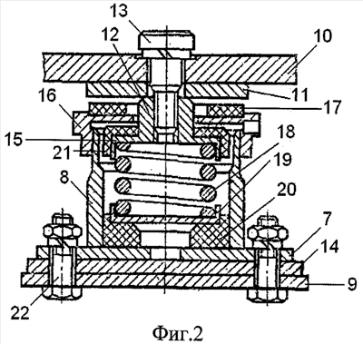 При колебаниях виброизолируемого объекта, установленного на опорном каркасе 2, пружина 18 воспринимает вертикальные нагрузки, ослабляя тем самым динамическое воздействие на оператора. Нелинейное демпфирование в системе осуществляется за счет наличия нижнего 20 и верхнего 21 ограничителей хода пружины 18, выполненных из эластомера. Горизонтальные колебания гасятся за счет нестесненного (с зазором) расположения нижнего опорного стакана 19 пружины 18 и верхней охватывающей пружину крышки 15.