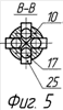 Кольцевая камера 5 (фиг.1) образована внутренней стенкой крышки 4 и верхней стенкой венца радиальных лопаток завихрителя 9. Для уплотнения соединения кольцевой камеры 5 с торцом трубы 13 установлена тарельчатая пружина 19 с притертыми контактными кромками. Дополнительное сужающее устройство 15 (фиг.1) установлено на торце трубы 13 и входит в состав незаменяемой части преобразователя расхода. Перфорированная перегородка 11 может быть закреплена на сужающем устройстве 12 (фиг.1) или на крышке 4 (фиг.2, 4). Она установлена под острым углом к выходящему из углового патрубка 2 потоку теплоносителя. Угол может составлять от 0 до 40°. Перегородка 11 может иметь перфорацию как на плоской, так и на боковой цилиндрической стенках (фиг.4). Суммарная площадь сечения отверстий перфорированной перегородки 11 меньше, чем площадь сечения проточной части после перегородки по ходу потока. Суммарная площадь сечения отверстий перфорированной перегородки 11 превышает суммарную площадь сечения отверстий дополнительного сужающего устройства 15 не менее, чем на порядок. Крышка 4 герметизируется в корпусе 1 узлом уплотнения 20. Узел съема сигнала 16 прижимается к крышке 4 фиксатором 21 (фиг.1). Сужающее устройство 12 имеет калиброванные отверстия 22, суммарная площадь сечения которых должна выполняться с максимально возможной точностью и обеспечивать стабильность выходной характеристики шарикового преобразователя расхода при смене заменяемого узла. Труба 13 может быть выполнена изогнутой (фиг.1) или прямой (фиг.2, 4). Предпочтительный способ крепления трубы 13 к сужающему устройству 12 – осадка с натягом. Проектное взаимное расположение корпуса 1, сужающего устройства 12, крышки 4, кольцевой камеры 5 обеспечивается установочными элементами 23. Сужающее устройство 12 уплотняется в корпусе 1 при помощи разрезного пружинного кольца 24. Стержень-вытеснитель может быть выполнен с продольными пропилами 25 (фиг.4, 5).