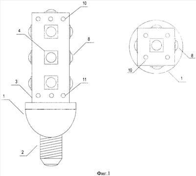 Изобретение поясняется чертежами, где на фиг.1 представлена конструктивная, а на фиг.2 – электрическая схема заявленного светильника, включающего следующие позиции: 1 – корпус, прикрепленный к стандартному цоколю 2, 3 – четырехгранный стакан, гранями которого являются секции 4 светодиодов, 5 – блок питания, включающий в себя сетевой дроссель 6 и блок 7, состоящий из стабилизатора тока и выпрямителя, 8 – светодиод, 9 – стабилитрон, 10 и 11 – отверстия соответственно в верхней и нижней частях корпуса 1. Стакан 3 может быть трехгранным или шестигранным. Светодиоды 8 установлены на секциях светодиодов 4 своей излучающей частью наружу стакана 3, что обеспечивает равномерное и качественное освещение территории вокруг светильника.