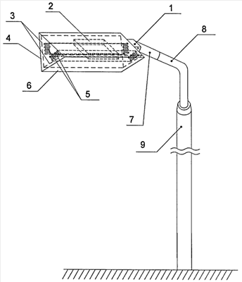 Изобретение поясняется прилагаемым чертежом, на котором изображено основание 1 пятигранной призмы (с поперечным сечением в виде треугольника), к которому крепятся блок питания 2 и боковые стенки 3, выполненные из светодиодных плат. В пазы торцевых стенок 4, имеющих перфорации 5, размеры и конфигурация отверстий которой выполнена из условия оптимального конвекционного обмена воздуха, нагреваемого внутри корпуса с окружающим пространством, входят края боковых стенок 3 и оптически прозрачного колпака 6, который крепится к торцевым стенкам снаружи корпуса, с расчетным зазором, эквидистантно к стакану. 7 – узел крепления осветительного устройства к консоли 8 столба 9, представляющий собой пластину с патрубком, который может изменять свое положение относительно консоли столба с помощью регулировочных болтов. Для потолочного и пристенного креплений осветительного устройства к нему шарнирно крепится скоба, также фиксируемая регулировочными болтами в нужном положении.