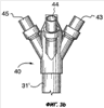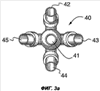 Фиг.3а и 3b показывают делитель 40 импульсов, который может быть использован для того, чтобы направить один газовый импульс в несколько (в этом случае в пять) подающих труб, каждая из которых имеет один или несколько выпусков (не показаны). Делитель 40 импульсов имеет основную трубу 31′ для приема газового импульса от газовой пушки (не показана) вышеописанного типа, причем центральная ветвь 41 находится на одной оси с основной трубой 31′, а также четыре патрубка 42, 43, 44 и 45, которые отходят от основной трубы под углом приблизительно 135 градусов к продольной оси основной трубы. Патрубки расположены вокруг периферии основной трубы через равные промежутки, т.е под углом 90 градусов друг к другу. Диаметры патрубков одинаковы, при этом они меньше диаметра основной трубы, поскольку из-за того, что в точке деления происходит разделение газового потока приблизительно на четыре равные части, объем газа, который нужно пропустить через каждый патрубок, будет меньше. Во избежание каких-либо перепадов давления отверстия на концах каждой трубы будут такими же, как и подведенные к ним трубы.