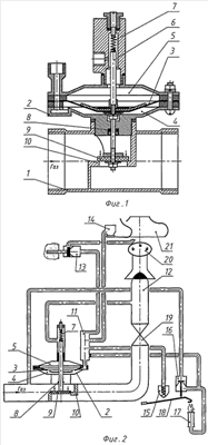 Таким образом, технический результат достигается за счет того, что шток выполнен общим для надмембранной и подмембранной полостей и снабжен регулируемой пружиной, при этом подмембранная полость сообщается с датчиками температуры, тяги, пламени с помощью импульсных трубок и обеспечивается давлением газа через датчик сетевого газа и жиклер управляющего канала, а надмембранная полость сообщается с газораспределительной трубой горелки, на общий шток в надмембранной полости воздействует регулируемая пружина, а на подвижный клапан – увеличенное давление газа в подводящем газопроводе, что обеспечивает дополнительную функцию автоматического снижения давления газа до установленной величины, при внезапном увеличении давления газа в подводящем газопроводе.