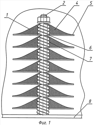 Между отбойными элементами установлены на стержне дистанционирующие втулки 6, на которых предусмотрена углубленная винтовая нарезка 7. Установка блоков производится с помощью сварки на горизонтальных решетчатых полках 8 (отверстия не показаны).