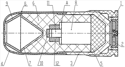 В российском патроне [патент RU 2294520, F42B 12/10, 27.12.06], выбранном прототипом настоящего предполагаемого изобретения недостатки снаряда аналога в значительной мере устранены.