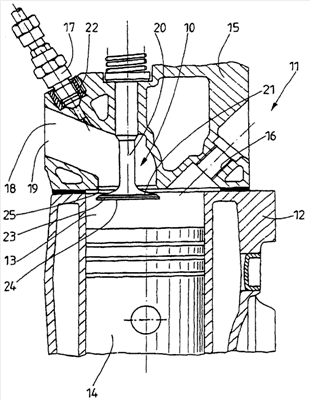 В еще свободном отверстии 16 для установки свечи зажигания в головке 15 цилиндра устанавливается светочувствительный орган. При этом, предпочтительно, имеется в виду светочувствительный датчик (не показан). Светочувствительный датчик может быть выполнен таким образом, чтобы он проходил через отверстие 16 для установки свечи зажигания и уплотнял его относительно прохождения света, так что светочувствительный датчик препятствует прохождению света через отверстие 16 для установки свечи. Светочувствительный датчик может быть вставлен в отверстие 16 для установки свечи зажигания таким образом, что его детекторная головка находится в области отверстия 16 для установки свечи зажигания. Однако светочувствительный датчик, предпочтительно, выполняется в виде стержня и вставляться в отверстие 16 для установки свечи зажигания настолько, чтобы светочувствительный элемент датчика располагался в верхней области камеры 13 сгорания, до которой сам поршень 14 даже в своем самом верхнем положении (в верхней мертвой точке) не достает. Благодаря этому светочувствительный датчик с его светочувствительной измерительной частью может регистрировать прохождение света поблизости от клапанной тарелки 23 клапана 10, в частности, с нижней стороны 24 клапанной тарелки 23.