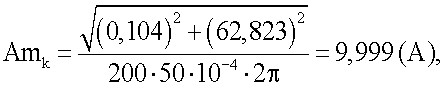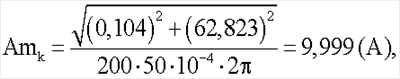 Сразу поле этого из программатора определения амплитуды и фазы по вольтамперной характеристике 2 (АФВАХ) значения амплитуды Amk и фазы k передают на второй программатор 5 (П2), а сигнал о задании следующей частоты на первый программатор 4 (П1). После этого во втором программаторе полученные значения амплитуды Am1=9,999 А и фазы 1=-0,095° запоминают вместе со значением 1=50·2 Рад/с из первого программатора 4 (П1), а из первого программатора 4 (П1) передают следующее значение частоты 02=100·2 на первый датчик опорного сигнала 3 (ДОС1), второй датчик опорного сигнала 6 (ДОС2) и на второй программатор 5 (П2). Все действия для определения остальных Amk и k повторяют до достижения 0k=150·2 Рад/с. После чего на выход второго программатора 5 (П2) подали сигнал о готовности результатов спектрального анализа.