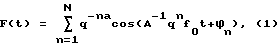 Генератор фрактального сигнала содержит генератор 1 сигнала типа “меандр” с коэффициентом заполнения 0,5, амплитудой ~4,5 В (уровень “0” – 0 – 0,75 В; уровень “1” – 4,3 – 5 В) и частотой f0 = 256 МГц, выполненный, например, на основе высокостабильного кварцевого генератора. К генератору 1 последовательно подключены, например, 10 параллельных цепочек, в каждой из которых последовательно соединены делитель 2 частоты, полосовой фильтр 3, усилитель 4. Для случая q = 2 и А = 100 делители частоты 2 могут быть выполнены в виде счетчиков, начальные состояния которых устанавливаются независимо для каждого счетчика перед запуском всего генератора фрактального сигнала. Начальные состояния счетчиков определяют начальные фазы n (см. выражение (1)) с точностью ![]() = A-1q-n-1. Полосовые пассивные фильтры 3 выполнены на основе известных RLC-схем и при условии ![]() n/ n < 10-2 и наклоном АЧХ в полосах подавления 40 дБ/декаду преобразуют сигнал типа “меандр” в гармонический (синусоидальный) сигнал. Усилители 4 с регулируемым коэффициентом усиления kус могут быть выполнены на основе операционных усилителей. Выходы усилителей 4 подключены к соответствующим входам аналогового сумматора 5, выход которого является выходом генератора фрактального сигнала.
