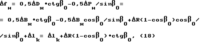 Из треугольников K1K3K5 и К2К4К5 следует, что![]() Так как K1K4 = 0,5 (dk0 – dk); К2К4 = 0,5(lk – lk0), то 0,5 P = 0,5(dk0-dk) cos 0+0,5(lk-lk0) sin 0.Так как в блоке 6 (см. фиг. 3) выполняется операция C + E, то Pв= dk cos 0-2 lk sin 0 (19)Но так как dk= dж+2 r(1-cos 0), (20)то ![]() Так как в блоке 5 (см. фиг. 3) выполняется операция A + B, то на выходе блока 7 будет сигнал смещения линии контакта ![]() знак которого соответствует действительному. Перед началом измерений колец настраивают показания индикаторов 8 и 9 на “ноль” при измерении образцовой детали, имеющей номинальные размеры радиуса кривизны поверхности желоба, диаметр желоба дорожек качения, расстояния в наружном двухрядном кольце между сечениями, в наружном однорядном между базовым торцом и сечением, во внутреннем кольце между базовым торцом и сечением, которые соответствуют номинальному углу контакта шариков с дорожками качения колец в подшипнике. Погрешность измерения смещения линий контакта: – в наружном кольце ![]() – во внутреннем кольце ![]() При угле контакта 0 = 36o будем иметь(1-cos 0) ctg 0= 0,262.Максимальная погрешность при R = r = 0,04 мм; ПLk= 2 0,04 0,262 = 0,021 мм; Пlk= -0,04 0,262 = 0,010 мм.