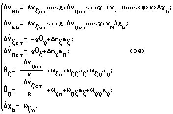 Вычисляются радиусы кривизны меридиана M, первого вертикала N и параметр R0:![]() ![]() ![]() Вычисляются азимут гироплатформы и истинный курс ИКВ :![]() ИКВ= г+ . (28)Вычисляются скорости в осях сопровождающего трехгранника VN, VE: VN= V cos +V sin ; (29)VE= V sin -V cos -NUcos ИКВ. (30)Вычисляются географическая широта ИКВ и географическая долгота ИКВ :![]() ![]() После окончания полета вычислителем 5 погрешностей инерциальной навигационной системы производится комплексная обработка данных, собранных во время полета регистратором 4 навигационной информации. Комплексная обработка информации производится с использованием известных методов идентификации источников погрешностей инерциальных навигационных систем, например с использованием фильтра Калмана [2]. При этом расчеты производятся как в прямом, так и обратном времени. В процессе этой обработки производится расчет следующих погрешностей инерциальной навигационной системы 1: ![]() n, ![]() n, ![]() n – недокомпенсированные постоянные составляющие дрейфов гироскопов;![]() ![]() , ![]() ![]() – дрейфы гироскопа с измерительной осью , пропорциональные действующим ускорениям по осям и соответственно;![]() ![]() , ![]() ![]() – дрейфы гироскопа с измерительной осью , пропорциональные действующим ускорениям по осям и соответственно; m , m – погрешности масштабных коэффициентов акселерометров; V b, V b – скомпенсированные перед полетом постоянные дрейфы гироскопов.