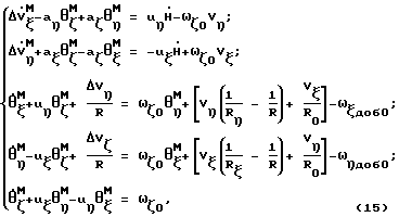 Вычисляются поправки на постоянные дрейфы гироскопов к измеренным линейным скоростям ![]() др0,![]() др0 :![]() др0= R![]() ф0; (13)![]() др0= -R![]() ф0. (14)Решается система дифференциальных уравнений движения гироплатформы под воздействием методических погрешностей: ![]() где VM , VM – погрешности (методические) инерциальной навигационной системы 1 в определении составляющих абсолютных скоростей, M , M , M – погрешности (методические) инерциальной навигационной системы 1 в определении вертикали и курса.