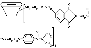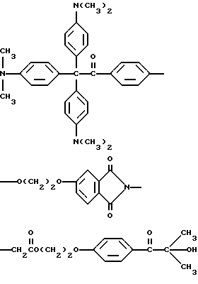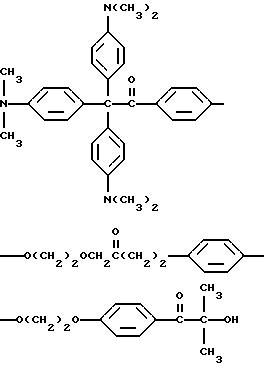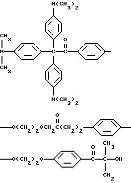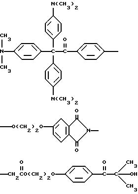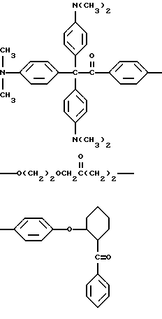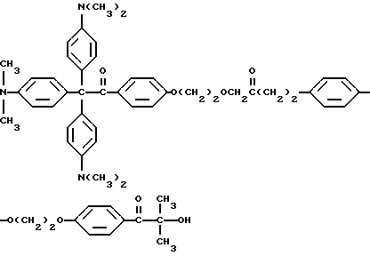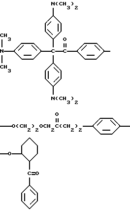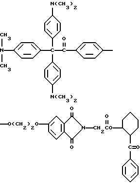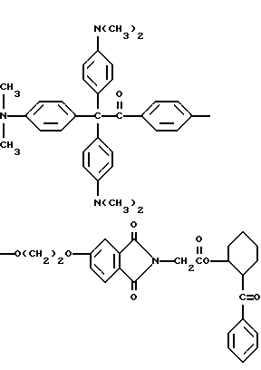 В каждом случае приблизительно 10 мг композиции помещают на стальную пластину (Q-Panel Company, Cleveland, Ohio). Наверх композиции помещают три капли (около 0,3 мл) ацетонитрила (Burdick and Jackson, Muskegon, Michigan), и два материала быстро перемешивают шпателем и распределяют на пластине в виде тонкой пленки. В пределах 5-10 с после добавления ацетонитрила каждую пластину подвергают воздействию излучения от комплекта ламп возбуждения на 222 нм. Комплект состоит из ряда четырех цилиндрических ламп, имеющих длину около 30 см. Лампы охлаждают циркулированием воды через расположенную в центре или внутреннюю трубку лампы, и вследствие этого они функционируют при относительно низкой температуре, т. е. приблизительно при 50oC. Плотность энергии у наружной поверхности ламп обычно находится в диапазоне от около 4 до около 20 Дж/м2. Однако такой диапазон в действительности отражает только возможности поставки потока энергии лампы возбуждения; в будущем могут быть выгодными более высокие плотности энергии. Расстояние от лампы до облучаемого образца составляет 4,5 см. Для каждой пленки измеряют время, когда она становится бесцветной для глаз. Результаты суммированы в табл. 3.