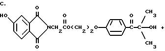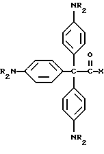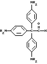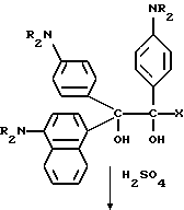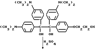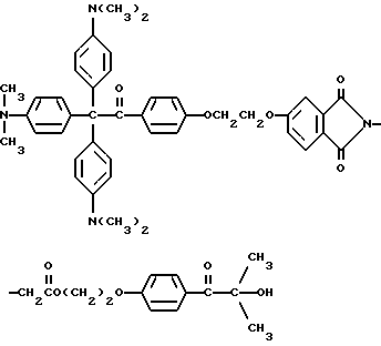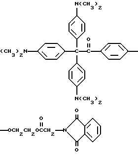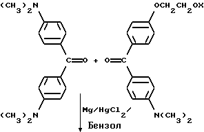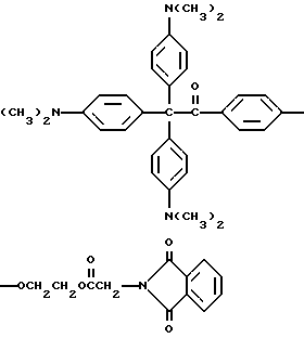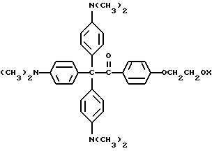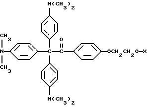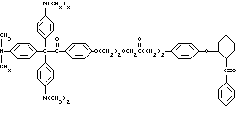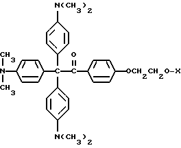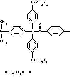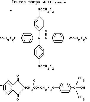 Пример 25В этом примере описывается способ получения следующего прекрасителя по настоящему изобретению, где X представляет фотоинициатор или где X представляет специфический для длины волны сенсибилизатор ![]() Методику примеров 1 и 2 повторяют, за исключением того, что гидроксиэтоксидиметиламинобензофенон примера 1 заменяют на X-оксиэтоксидиметиламинобензофенон. Реакцию суммируют следующим образом: ![]() ![]() ![]() Пример 26 В этом примере описывается получение следующего прекрасителя ![]() Указанный выше прекраситель получают, как суммировано ниже в стадиях A, B и C. ![]() ![]() ![]() Триарилметановый продукт, полученный в примере 2, подвергают реакции с продуктом реакции стадии B, как суммировано в приведенной ниже стадии C реакции ![]() ![]() ![]() Пример 27 В этом примере описывается получение следующего прекрасителя, где X представляет трансорбер излучения и где R представляет водород, метильную или этильную группу ![]() Методику примеров 1 и 2 повторяют, за исключением того, что гидроксиэтоксидиметиламинобензофенон и бис-диметиламинобензофенон примера 1 заменяют реагентами в реакции, суммированной следующим образом: ![]() ![]() ![]() Поскольку имеется таким образом описанное изобретение, различные изменения и модификации его легко будут очевидны специалистам данной области. Формула изобретения