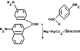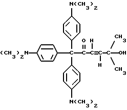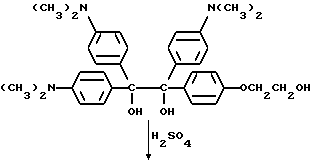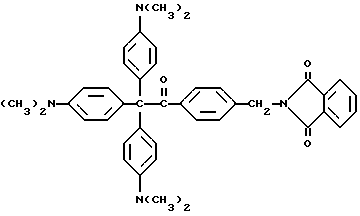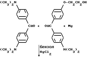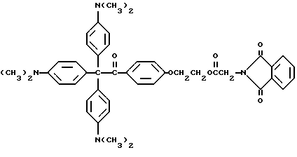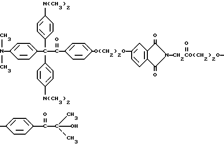 Пример 1Получение исходного материала типа пинакола Исходный материал для молекулы прекрасителя, который будет иметь синий цвет при облучении, получают в соответствии со следующей реакцией: ![]() ![]() В круглодонную трехгорлую колбу на 500 мл, снабженную магнитной мешалкой, холодильником, капельной воронкой, помещают 10 г (0,037 моль) бис-диметиламинобензофенона (Aldrich Chemical Company, Inc., Milwaukee, Wisconsin), 1 г гидроксиэтоксидиметиламинобензофенона (Aldrich Chemical Company, Inc. , Milwaukee, Wisconsin) и 0,75 г магниевых стружек (Aldrich Chemical Company, Inc. , Milwaukee, Wisconsin). В реакционную смесь выливают 200 мл безводного бензола, и смесь нагревают до 50oC и медленно добавляют 0,84 г хлорида ртути в 20 мл бензола в течение 20 мин. Реакцию инициируют добавлением в колбу небольшого кристалла иода. Реакционную смесь нагревают в течение 30 мин. Органический слой отделяют, сушат, и растворитель удаляют при пониженном давлении, получая желтый твердый продукт. Этот продукт пропускают через короткую колонку с силикагелем с применением 50%-ного этилацетата в гексане в качестве растворителя. Масс-спектр: 538 (М+-ОН), 521, 480, 252. Пример 2 Продукт примера 1 обрабатывают в соответствии со следующей реакцией: ![]() ![]() В круглодонную колбу на 250 мл добавляют 5,0 г (9 ммоль) диола из примера 1 и помещают магнитную мешалку. Добавляют 50 мл 50%-ной концентрированной серной кислоты в воде, и реакционную смесь перемешивают на водяной бане в течение 1 ч. Затем pH реакционной смеси устанавливают вплоть до около 7,0 добавлением гидроксида натрия. Осадок отделяют фильтрованием и сушат в вакууме в течение 2 ч. Выход 4,2 г (88%). Масс-спектр: 537 (М+), 520, 448, 433. Пример 3 Продукт примера 2 подвергают следующей реакции: ![]() ![]() В круглодонную колбу на 250 мл, снабженную магнитной мешалкой, устройством для улавливания воды Дина и Старка и холодильником, добавляют 4,0 г (7,6 ммоль) кетона из примера 2, 1,5 г фталоилглицина (Aldrich Chemical Company, Inc. , Milwaukee, Wisconsin), 0,1 г п-толуолсульфоновой кислоты (Aldrich Chemical Company, Inc., Milwaukee, Wisconsin) и 100 мл безводного бензола (Aldrich Chemical Company, Inc., Milwaukee, Wisconsin). Реакционную смесь нагревают при кипячении с обратным холодильником в течение 8 ч, причем после этого времени в устройстве для улавливания воды собирают 0,3 мл воды. Удаление растворителя при пониженном давлении дает 5,0 г продукта. Пример 4 0,2 г Продукта из примера 3 растворяют в 5 мл ацетонитрила (Ficher Scientific, Pittsburg, Pennsylvania). На металлическую пластину (Q-panel) помещают 3 капли смеси, и при помощи шпателя смесь распределяют по пластине. Пластину подвергают воздействию излучения возбуждением на 222 нм при движении со скоростью 12,19 м/мин (40 футов/мин) на транспортере. При действии излучения проявляется глубокий синий цвет. Четыре капли помещают на лист белой бумаги (Neenah bond) и оставляют для распределения на нем. Влажный лист затем подвергают воздействию излучения возбуждением при 222 нм. Влажная часть площади приобретает глубокий синий цвет. Пример 5 Лейкокраситель (лейкокраситель кристаллического фиолетового) (Aldrich Chemical Company, Inc., Milwaukee, Wisconsin) смешивают с композицией, содержащей трансорбер излучения, присоединенный к -циклодекстрину, и представленной следующей формулой: -циклодекстрин![]() Синтез трансорбера излучения, присоединенного к -циклодекстрину, описывается в примерах 8-11 и в находящейся в процессе одновременного рассмотрения заявке на патент США N 08/461372, поданной 5 июня 1995 и включенной здесь в качестве ссылки. 0,1 