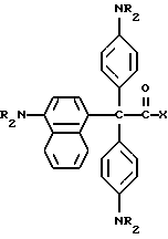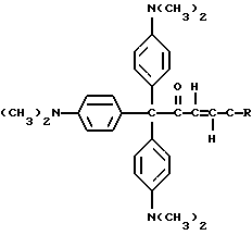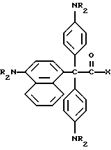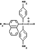 (57) Реферат: Изобретение относится к стабильным к воздействию света красителям, которые могут быть использованы в способах печати, получения фотоизображений, системах безопасности. Описывается композиция прекрасителя, содержащая молекулу прекрасителя, включающую краситель, ковалентно связанный с трансорбером излучения, образованным из селективного для длины волны сенсибилизатора, ковалентно связанного с фотореактором, генерирующим реакционную способность молекулы, причем молекула прекрасителя является бесцветной и образовывает цвет при обработке излучением. Технический результат: достижение стабильности красителя к действию света. 4 с. и 21 з.п. ф-лы, 3 табл. Эта заявка является частично продолжением заявки США N 08/649754, поданной 29 мая 1996, которая является частично продолжающейся заявкой США N 08/463187, поданной 5 июня 1995, которые, таким образом, включены здесь в качестве ссылки. Настоящее изобретение относится к новым прекрасителям, которые являются бесцветными и проявляют цвет при воздействии определенных длин волн электромагнитного излучения. Настоящее изобретение относится также к способам изменения обычных лейкокрасителей для образования окрашенных композиций при воздействии определенных длин волн электромагнитного излучения. Хорошо известно, что красители в их восстановленной лейкоформе могут обеспечить основу систем, образующих цветные изображения. Лейкокрасители могут быть первоначально относительно бесцветными, но могут возвращаться в окрашенную форму при окислении, например, нитратными солями при нагреве. Примеры лейкокрасителей, используемых в системах, образующих окрашенные изображения, включают триарилметаны, ксантены, стириловые красители и азиновые красители, такие, как, например, феназины, феноксазины и фенотиазины. Известно также, что лейкоформа данного красителя может быть нестабильной в условиях окружающей среды и может часто самопроизвольно возвращаться в окрашенную форму красителя. Эта тенденция повышается, когда для достижения интенсификации контраста добавляют фотоокислители, например, тригалогенметилсоединения, которые при экспонировании отщепляют радикалы галогена. Поэтому для композиций лейкокрасителей рекомендован ряд стабилизаторов, например, серусодержащие соединения, фенолы и другие восстановители. Таким образом, необходим лейкокраситель, который стабилен в растворе даже в присутствии искусственного или солнечного света. Идеальный лейкокраситель можно превратить в стабильные окрашенные молекулы воздействием электромагнитного излучения, которое обычно не может присутствовать в обычном свете. Таким образом, задачей изобретения является создание стабильных лейкопроизводных красителей, которые могут быть трансформированы в стабильную окрашенную молекулу. Одним осуществлением настоящего изобретения является способ и композиция, содержащая молекулу нового прекрасителя, который является бесцветным и стабильным к действию обычного света. Молекула прекрасителя способна образовать цвет при воздействии определенных длин волн электромагнитного излучения. Новым прекрасителем настоящего изобретения, в частности, является краситель, который ковалентно присоединен к трансорберу излучения. Получаемая молекула прекрасителя стабильна при обычном свете, но измен