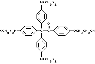 ![]() или 1-гидроксициклогексанфенилкетон, имеющий следующую формулу ![]() 4. Композиция прекрасителя по п.1, отличающаяся тем, что селективный для длины волны сенсибилизатор представляет фталоилглицин, имеющий формулу ![]() или 4-(4-гидроксифенил)бутан-2-он, имеющий следующую формулу ![]() 5. Композиция прекрасителя по п. 1, отличающаяся тем, что трансорбер излучения представляет 2-(п-(2-метиллактоил)фенокси)этил-1,3-диоксо-2-изоиндолинацетат, имеющий формулу ![]() эфир фталоилглицилциклогексилфенилкетона, имеющий формулу ![]() 2-гидрокси-2-метил-4′-(2-(п-(3-оксобутил)фенокси)этокси)пропиофенон, имеющий формулу ![]() или 4-(п-((4-бензоилциклогексил)окси)фенил)-2-бутанон, имеющий формулу ![]() 6. Композиция прекрасителя по п. 1, отличающаяся тем, что краситель представляет кристаллический фиолетовый и молекула прекрасителя имеет следующую формулу ![]() где X представляет трансорбер излучения. 7. Композиция прекрасителя по п. 6, отличающаяся тем, что молекула прекрасителя имеет формулу ![]() ![]() ![]() ![]() или ![]() 8. Композиция прекрасителя по п. 1, отличающаяся тем, что молекула прекрасителя имеет формулу ![]() или ![]() где X представляет трансорбер излучения; R представляет водород, метильную или этильную группу. 9. Способ проявления цвета прекрасителя при обработке его излучением, отличающийся тем, что в качестве прекрасителя используют композицию прекрасителя по п.1 и обработку ведут излучением при длине волны и уровне дозировки, достаточных для необратимого изменения молекулы прекрасителя. 10. Способ по п.9, отличающийся тем, что краситель представляет собой аминотриарилметан или его производное. 11. Способ по п.9, отличающийся тем, что фотореактор представляет 1-[4-(2-гидроксиэтокси)фенил]-2-гидрокси-2-метилпропан-1-он, имеющий следующую формулу ![]() или 1-гидроксициклогексанфенилкетон, имеющий следующую формулу ![]() 12. Способ по п. 9, отличающийся тем, что селективный для длины волны сенсибилизатор представляет фталоилглицин, имеющий следующую формулу ![]() или 4-(4-гидроксифенил)бутан-2-он, имеющий следующую формулу ![]() 13. Способ по п. 9, отличающийся тем, что трансорбер излучения представляет собой 2-(п-(2-метиллактоил)фенокси)этил-1,3-диоксо-2-изоиндолинацетат, имеющий формулу ![]() эфир фталоилглицилциклогексилфенилкетона, имеющий формулу ![]() 2-гидрокси-2-метил-4′-(2-(п-(3-оксобутил)фенокси)этокси)пропиофенон, имеющий формулу ![]() или 4-(п-((4-бензоилциклогексил)окси)фенил)-2-бутанон, имеющий формулу ![]() 14. Способ по п.9, отличающийся тем, что краситель представляет собой кристаллический фиолетовый и молекула прекрасителя имеет следующую формулу ![]() где X представляет трансорбер излучения. 15. Способ по п.14, отличающийся тем, что молекула прекрасителя имеет формулу ![]() ![]() ![]() ![]() или ![]() 16. Композиция изменяемого красителя, содержащая лейкокраситель, смешанный с трансорбером излучения, содержащим селективный для длины волны сенсибилизатор, ковалентно связанный с фотореактором, генерирующим реакционноспособную разновидность молекулы. 17. Композиция изменяемого красителя по п.16, отличающаяся тем, что лейкокраситель представляет собой лейкоаминотриарилметан или его производное. 18. Композиция изменяемого красителя по п.16, отличающаяся тем, что фотореактор представляет собой 1-[4-(2-гидроксиэтокси)фенил]-2-гидрокси-2-метилпропан-1-он, имеющий следующую формулу ![]() или 1-гидроксициклогексанфенилкето
