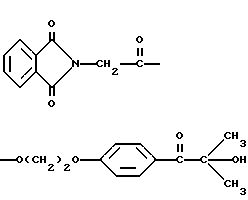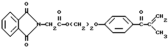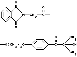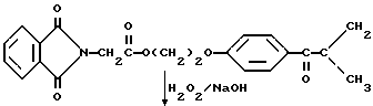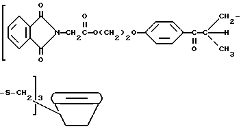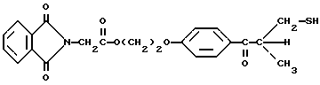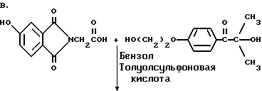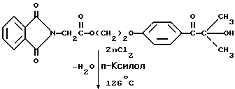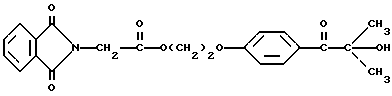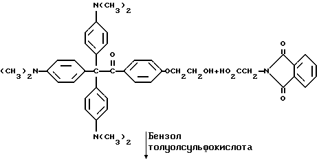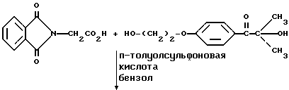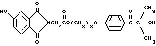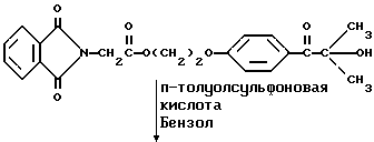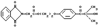 Пример 8Этот пример описывает способ получения трансорбера ультрафиолетового излучения, 2-[п-(2-метиллактоил)фенокси] этил-1,3-диоксо-2-изоиндолинацетата, обозначенного фталоилглицином-2959. В трехгорлой круглодонной колбе на 250 мл, снабженной устройством для улавливания воды Дина и Старка с холодильником и двумя стеклянными пробками, смешивают следующие компоненты: 20,5 г (0,1 моль) селективного для длины волны сенсибилизатора, фталоилглицина (Aldrich Chemical Co., Milwaukee, Wisconsin); 24,6 г (0,1 моль) фотореактора, DARCUR 2959 (Ciba-Geigy, Hawthorne, New York); 100 мл бензола (Aldrich Chemical Co., Milwaukee, Wisconsin) и 0,4 г п-толуолсульфоновой кислоты (Aldrich Chemical Co., Milwaukee, Wisconsin). Смесь нагревают при кипячении с обратным холодильником в течение 3 ч, причем в течение этого времени собирают 1,8 мл воды. Растворитель удаляют при пониженном давлении, получая 43,1 г белого порошка. Порошок перекристаллизуют из 30% этилацетата в гексане (Fisher), получая 40,2 г (93%) белого кристаллического порошка, имеющего точку плавления 153-4oC. Реакцию суммируют следующим образом: ![]() ![]() Получаемый продукт, обозначенный фталоилглицином-2959, имеет следующие физические параметры: ИК [NUJOL MULL] max 3440, 1760, 1740, 1680, 1600 см-1. 1H ЯМР [CDCl3] м.д. 1,64 [с], 4,25 [м], 4,49 [м], 6,92 [м], 7,25 [м] , 7,86 [м], 7,98 [м], 8,06 [м] м.д.