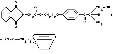 В круглодонной колбе на 100 мл смешивают следующие компоненты: 5,0 г (4 ммоль) -циклодекстрина (American Maize Product Company, Hammond, Indiana) (обозначается как -CD в следующей реакции); 8,3 г (20 ммоль) дегидратированного фталоилглицина-2959; 50 мл безводного ДМФ; 20 мл бензола и 0,01 г п-толуолсульфонилхлорида (Aldrich Chemical Co., Milwaukee, Wisconsin). Смесь охлаждают на бане соль/лед и перемешивают в течение 24 ч. Реакционную смесь выливают в 150 мл слабого раствора бикарбоната натрия и экстрагируют три раза по 50 мл этилового эфира. Водный слой затем фильтруют, получая белый твердый продукт, содержащий -циклодекстрин с присоединенной группой фталоилглицина-2959. Получают продукт с выходом 9,4 г. ТСХ на пластинке с обращенной фазой с использованием смеси 50:50 ДМФ/ацетонитрил показала пик нового продукта по сравнению с исходными материалами![]() ![]() Молекула -циклодекстрина имеет несколько первичных спиртов и вторичных спиртов, с которыми может реагировать фталоилглицин-2959. Приведенная выше реакция показывает для иллюстративных целей только одну молекулу фталоилглицина-2959.
