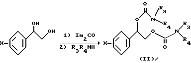 ПРИМЕР XIII(R)-N-Метил(2-(2-хлорфенил)-2-(N-метилкарбамоилоксиэтил)- оксокарбоксамид: Общая методика получения N,N-дизамещенных карбаматов Раствор (R)-2-хлорфенил-1,2-этандиола (2.0 г, 11.6 ммоль) в тетрагидрофуране добавляют по каплям к суспензии 1,1′- кабонилдиимидазола (4.13 г, 25.5 ммоль) в тетрагидрофуране (10 мл) при 5oC в течение 20 мин. После перемешивания при комнатной температуре в течение 1 ч добавляют метиламин (23.2 мл, 2 М раствор в ТГФ, 46.4 ммоль) при 5oC. После перемешивания при комнатной температуре в течение 18 ч реакционную смесь концентрируют в вакууме и очищают флеш-хроматографией с получением белого твердого вещества (2.03 г, выход 61%, т.пл. 152-154oC). ПРИМЕР XIV (R)-N-Изопропил(2-(2-хлорфенил)-2-(N-изопропилкарбамоилоксиэтил)- оксокарбоксамид (R)-N-Изопропил(2-(2-хлорфенил)-2-(N-изопропилкарбамоилоксиэтил)- оксокарбоксамид (3.50 г, выход 88%, т.пл. 151-153oC, [ ]D = 1.33 (с=2.63, MeOH)) получают с использованием методики, описанной в примере XIII, за исключением того, что вместо метиламина используют изопропиламин.