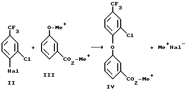 (57) Реферат: Изобретение относится к улучшенному способу выделения из водного раствора 3-[2-хлор-4-(трифторметил)-фенокси] бензойной кислоты, которая является промежуточным продуктом для получения таких гербицидов, как ацифторфен, фторогликофен и лактофен. Способ заключается в том, что а) металлическую соль, например натриевую или калиевую соль, 3-[2-хлор-4-(трифторметил)-фенокси] бензойной кислоты подвергают взаимодействию с неорганической или органической кислотой, желательно до значения pH менее 5; б) полученную реакционную смесь, содержащую твердый осадок указанной бензойной кислоты, нагревают до плавления последнего (обычно до температуры по меньшей мере 90-96°C). Возможно совмещение стадий а) и б). При этом в обоих случаях получают жидкую двухфазную систему, состоящую из органической и водной фазы. Органическую фазу, содержащую целевую бензойную кислоту, отделяют от водной фазы. Возможно проведение обезвоживания органической фазы, полученной на последней стадии. Способ позволяет получить продукт высокого качества с высоким выходом и упростить процесс за счет исключения работы с твердым веществом. 11 з.п. ф-лы. Изобретение относится к способу выделения (получения) 3-[2-хлор-4-(трифторметил)-фенокси]-бензойной кислоты по формуле I ![]() из водного раствора своей соли металла, при котором а) соль металла 3-[2-хлор-4-(трифторметил)-фенокси]-бензойной кислоты подвергают взаимодействию с органической или неорганической кислотой; b) реакционную смесь нагревают до образования жидкой двухфазной системы из органической и водной фаз и с) органическую фазу отделяют от водной фазы. 3-[2-хлор-4-(трифторметил)-фенокси] – бензойная кислота по формуле I является промежуточным продуктом для получения таких гербицидов, как ацифторфен, фторогликофен и лактофен, получение которых описано в заявках Германии DE-A 2311638, EP-A 20052, DE-A 3029728 и в патенте США US 4031131. Согласно описанию из US 4031131 производное бензойной кислоты формулы I осаждают в качестве кристаллизата из его соляного раствора посредством нейтрализации неорганической кислотой, выделяют фильтрацией, промывают водой и просушивают. Этот способ обладает некоторыми недостатками. Обращение с твердым веществом приводит при кристаллизации к образованию отложений, причем кристаллы воспринимают значительно больше воды. Это свойство приводит при сушке к засорениям и к ограниченной пропускной способности на производстве. Задачей предлагаемого изобретения является создание такого способа выделения 3-[2-хлор-4-(трифторметил)-фенокси] – бензойной кислоты, при котором эти недостатки отсутствуют. Эта задача решается тем, что соль металла 3-[2-хлор-4-(трифторметил)- фенокси] -бензойной кислоты подвергают взаимодействию с органической или неорганической кислотой; реакционную смесь нагревают до образования жидкой двухфазной системы из органической и водной фаз и органическую фазу отделяют от водной фазы. Получение производного бензойной кислоты формулы I производится согласно патенту США US 4031131 по следующей схеме: ![]() Производное трифторметилбензола по формуле II преобразуют взаимодействием с двойной солью металла 3-гидроксибензойной кислоты в соль металла производного бензойной кислоты по формуле IV. Выделение свободной кислоты производного бензойной кислоты общей формулы I происходит по способу согласно предлаг