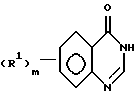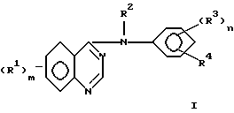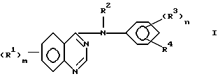 (57) Реферат: Предложены производные 4-(замещенного фениламино)хиназолина формулы 1, в которой m представляет 1 или 2, n представляет 1 или 2, каждый R1 независимо выбран из группы, состоящей из галогена; циано; гидрокси; R5; нитро; амино; трифторметила; С(=O)O R5, R5O, необязательно замещенного галогеном, гидрокси, (1-4)С алкокси, ацетокси, (1-4)С алкилпиперазинилом, морфолинилом, имидазолилом, 4-оксопиридилом или S(1-3)C – алкилом, необязательно замещенным карбокси; SO2R5; SR5, необязательно замещенного циано, (1-4)С алкилом, S(1-4)С алкилом или 4-цианофенильной группой; толуолсульфониламино, NHSO2R5; бензилсульфанила или фенилсульфанила, необязательно замещенного 1-2 атомами галогена; фенокси, необязательно замещенного 1-2 заместителями, выбранными из галогена, (1-4)С алкила, (1-4)С – алкокси, метансульфонила, метансульфанила и галогенфенилсульфанила; аллилсульфанила; винилокси, гуанидино и фтальимидо (1-4)С алкилсульфониламиногруппы; или два R1 фрагмента, взятые вместе в 6 и 7 положениях хиназолина, образуют метилендиоксигруппу, где алкильные группы и алкильные фрагменты указанных алкоксигрупп могут быть прямой цепью и, если они составлены, по крайней мере, из трех атомов углерода, могут быть разветвленными, R2 представляет водород, каждая R3 группа независимо выбрана из водорода, галогена и (1-4)алкила, R4 представляет азидо или (2-4)С алкинил, где указанный алкинил необязательно замещен гидрокси-, амино- или аминометильной группой, R5 представляет (1-4)С алкил, или их фармацевтически приемлемые соли. Указанные соединения ингибируют рецепторную тирозинкиназу и могут быть полезны при лечении гиперпролиферативных заболеваний, таких, как злокачественные опухоли у млекопитающих. Кроме того, предложены способ ингибирования рецепторной тирозинкиназы и фармацевтическая композиция, обладающая антипролиферативной активностью. 3 с. и 4 з.п. ф-лы, 2 табл.