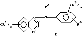 ![]() в которой m представляет 1 или 2, n представляет 1 или 2, каждый R1 независимо выбран из группы, состоящей из галогена; циано; гидрокси; R5, нитро; амино; трифторметила, C(=O)OR5, R5O, необязательно замещенного галогеном, гидрокси, (1-4)С алкокси, ацетокси, (1-4)С алкилпиперазинилом, морфолинилом, имидазолилом, 4-оксопиридилом или S(1-3)C алкилом, необязательно замещенным карбокси; SO2R5, SR5, необязательно замещенного циано, (1-4)С алкокси, S(1-4)С алкилом или 4-цианофенильной группой; толуолсульфониламино, NHSO2R5, бензилсульфанила или фенилсульфанила, необязательно замещенного 1-2 атомами галогена; фенокси, необязательно замещенного 1-2 заместителями, выбранными из галогена, (1-4)С алкила, (1-4)С алкокси, метансульфонила, метансульфанила и галогенфенилсульфанила; аллилсульфанила; винилокси, гуанидино и фталимидо (1-4)С алкилсульфониламино группы; или два R1 фрагмента, взятые вместе в 6 и 7 положениях хиназолина, образуют метилендиоксигруппу; и где алкильные группы или алкильные фрагменты указанных алкоксигрупп могут иметь прямую цепь и, если они составлены, по крайней мере, из трех атомов углерода, могут быть разветвленными; R2 представляет водород; каждая группа R3 независимо выбрана из водорода, галогена и (1-4)С алкила; R4 представляет азидо или (2-4)С алкинил, где указанный алкинил необязательно замещен гидрокси-, амино- или аминометильной группой; R5 представляет (1-4)С алкил; или их фармацевтически приемлемые соли. 2. Соединение по п.1, в котором R3 представляет водород, R4 представляет этинил или азидо, каждый R1 независимо выбран из карбометокси и (1-4)С алкокси, где алкокси необязательно замещен гидрокси, галогеном, (1-4)С алкокси или ацетокси. 3. Соединение по п.1, выбранное из группы, состоящей из: (6,7-диметоксихиназолин-4-ил)-(3-этинилфенил)-амин, (6,7-диметоксихиназолин-4-ил)-[3-(3′-гидроксипропин-1-ил)фенил]-амин, [3-(2′-(аминометил)этинил)фенил]-(6,7-диметоксихиназолин-4-ил)-амин, [3-этинилфенил]-(6-нитрохиназолин-4-ил)-амин, (6,7-диметоксихиназолин-4-ил)-(4-этинилфенил)-амин, (6,7-диметоксихиназолин-4-ил)-(3-этинил-2-метилфенил)-амин, (6-аминохиназолин-4-ил)-(3-этинилфенил)-амин, (3-этинилфенил)-(6-метансульфониламинохиназолин-4-ил)-амин, (3-этинилфенил)-(6,7-метилендиоксихиназолин-4-ил)-амин, (6,7-диметоксихиназолин-4-ил)-(3-этинил-6-метилфенил)-амин, (3-этинилфенил)-(7-нитрохиназолин-4-ил)-амин, (3-этинилфенил)-[6-(4′-толуолсульфониламино)хиназолин-4-ил)-амин, гидрохлорид (3-этинилфенил)-{6-[2′-фталимидо-1′-этил-сульфонил-амино]хиназолин-4-ил}-амина, (3-этинилфенил)-(6-гуанидинохиназолин-4-ил)-амин, (7-аминохиназолин-4-ил)-(3-этинилфенил)-амин, (3-этинилфенил)-(7-метоксихиназолин-4-ил)-амин, (6-кар6ометоксихиназолин-4-ил)-(3-этинилфенил)-амин, (7-карбометоксихиназолин-4-ил)-(3-этинилфенил)-амин, [6,7-бис(2-метоксиэтокси)хиназолин-4-ил]-(3-этинилфенил)-амин, (3-азидофенил)-(6,7-диметоксихиназолин-4-ил)-амин, (3-азидо-5-хлорфенил)-(6,7-диметоксихиназолин-4-ил)-амин, (4-азидофенил)-(6,7-диметоксихиназолин-4-ил)-амин, (3-этинилфенил)-(6-метансульфонил-хиназолин-4-ил)-амин, (6-этансульфанил-хиназолин-4-ил)-(3-этинилфенил)-амин, (6,7-диметоксихиназолин-4-ил)-(3-этинил-4-фтор-фенил)-амин, (6,7-диметоксихиназолин-4-ил)-[3-(пропин-1′-ил-фенил)]-амин, [6,7-бис(2-метокси-этокси)-хиназолин-4-ил] -(5-этинил-2-метил-фенил)-амин, [6,7-бис(2-метокси-этокси)-хиназолин-4-ил]-(3-этинил-4-фтор-фенил)-амин, [6,7-бис(2-хлор-этокси)-хиназолин-4-ил]-(3-этинилфенил)-амин [6-(2-хлор-этокси)-7-(2-метокси-этокси)хиназолин-4-ил)-(3-э