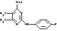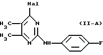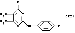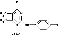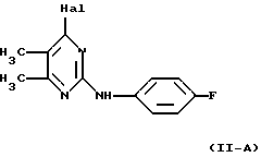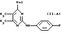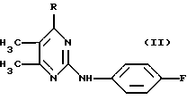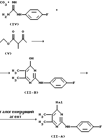 Препаративный пример: 4-фторфенилгуанидинкарбонат882 г (747 мл) 32% cоляной кислоты добавляют к 1000 г (8,9 моль) 4-фторанилина, смесь нагревают до 87oC и в течение 2 часов добавляют к ней по каплям 780 мл (9,9 моль) 50% раствора цианамида. Реакционную смесь доводят до pH 2,4 добавлением в нее 120 мл 32% соляной кислоты, перемешивают в течение 3 часов и охлаждают до 60oC. К реакционному раствору в течение 30 минут добавляют по каплям раствор Na2CO3 (Na2CO3/вода 578 г/1640 мл). Реакционную смесь перемешивают в течение 40 минут и затем охлаждают до 15oC. Полученный серый твердый продукт фильтруют, промывают сначала 600 мл воды и затем 2000 мл этилацетата и, наконец, сушат, получая 1395 г указанного в заголовке соединения, имеющего светло-серый цвет. Выход: 81,4% Т.пл.: 175oC ЯМР (ДМСО-d6, м.д.): 5,50-6,88 (уш.с, 5H), 6,87 (м, 2H), 7,17 (м, 2H) Пример 1: 4-Гидрокси-2-(4-фторфениламин)-5,6-диметилпиримидин 54,5 г (253,2 ммоль) 4-Фторфенилгуанидинкарбоната, полученного в Препаративном примере выше, суспендируют в 50 мл N,N-диметилформамида и 37,8 г (262,2 ммоль) этил-2-метил-ацетоацетата, и полученную суспензию кипятят с обратным холодильником при 140oC в течение 3 часов. Реакционный раствор вновь разбавляют 100 мл N,N-диметилформамида и охлаждают до 80oC. Добавляют к нему 160 мл изопропилового спирта и полученную смесь перемешивают в течение 30 минут. Образовавшийся твердый продукт отфильтровывают, промывают 150 мл ацетона и в конце сушат, получая 41 г названного в заголовке соединения. Выход: 61,4% Т.пл.: 256oC ЯМР (ДМСО-d6, м.д.): 1,83 (с, 3H), 2,19 (с, 3H), 7,18 (т, 2H), 7,68 (м, 2H), 9,36 (уш.с, 1H), 10,63 (уш.с, 1H). Пример 2: 4-Хлор-2-(4-фторфениламино)-5,6-диметилпиримидин 40,5 г (174,1 ммоль) 2-(4-Фторфениламино)-4-гидрокси-5,6- диметилпиримидина, полученного в примере 1, суспендируют в 80 мл N,N-диметилформамида и полученную суспензию нагревают до 80oC. В течение одного часа добавляют 31,9 г (19,4 мл, 210,1 ммоль) оксихлорида фосфора при постоянной температуре 85oC. Реакционный раствор перемешивают в течение 30 минут и затем при перемешивании к нему добавляют 400 г воды со льдом. Смесь доводят до pH 11 добавлением гидроксида натрия и затем отфильтровывают полученный твердый продукт. Выделенный твердый продукт промывают 150 мл 50% водного раствора метанола и затем сушат, получая 42,3 г названного в заголовке соединения. Выход: 96,7% Т.пл.: 114oC ЯМР (CDCl3, м.д.): 2,21 (с, 3H), 2,41 (с, 3H), 7,01 (т, 2H), 7,18 (уш.с, 1H), 7,56 (т, 2H). Пример 3: 4-Хлор-2-(4-фторфениламино)-5,6-диметилпиримидин 1390 г (7,6 моль) 4-Фторфенилгуанидин карбоната, полученного в Препаративном примере выше, суспендируют в 1300 мл N,N-диметилформамида и 1206 г (8,4 моль) этил-2-метилацето-ацетата. Полученную суспензию нагревают при кипячении с обратным холодильником в течение одного часа, перегоняют под нормальным давлением до 1100 мл и затем отгоняют до тех пор, пока температура реакционного раствора не достигнет 160oC. К остатку добавляют 1600 мл N, N-диметилформамида и затем охлаждают до 80oC. К смеси за один час добавляют при постоянной температуре 80-85oC 1388 г (840 мл, 9,1 моль) оксихлорида фосфора. Реакционный раствор перемешивают в течение 30 минут и затем разбавляют 2000 мл N,N-диметилформамида. К разбавленному раствору в течение 40 минут добавляют при перемешивании 7000 мл воды. Реакционный раствор перемешивают в течение 4 часов, полученный продукт отфильтровывают, промывают 1500 мл 50% водного раствора метанола и затем сушат. Полученный таким образом высушенный желтовато-коричневый порошок растворяют в 4000 мл метанол
