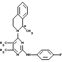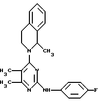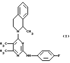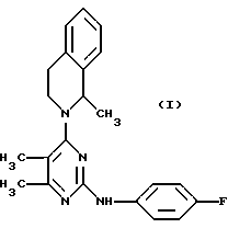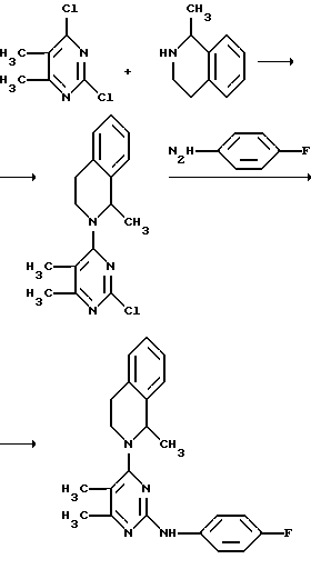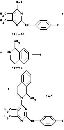 ![]() и его солей присоединения кислот, отличающийся тем, что производное пиримидина, представленное следующей формулой II-A: ![]() котором Hal представляет галоген, взаимодействует с 1-метил-1,2,3,4-тетрагидроизохинолином, представленным следующей формулой III: ![]() 2. Способ по п.1, отличающийся тем, что соль присоединения кислоты является гидрохлоридом. 3. Способ по п.1, отличающийся тем, что взаимодействие проводят в присутствии растворителя. 4. Способ по п.3, отличающийся тем, что растворителем является N,N-димeтилфopмaмид, н-бутанол, н-пентанол, н-гексанол, диметилсульфоксид, этиленгликоль, 1,2-пропиленгликоль или их смесь. 5. Способ по п.1, отличающийся тем, что взаимодействие проводят в присутствии основания. 6. Способ по п.5, отличающийся тем, что основанием является триэтиламин, N,N-диметиланилин, пиридин или ацетат калия. 7. Способ по п. 1, отличающийся тем, что соединение формулы I в виде (R)-(+)-изомера получают, используя (R)-(+)-1-метил-1,2,3,4-тетрагидроизохинолин. 8. Способ по п. 1, отличающийся тем, что соединение формулы I в виде (S)-(-)-изомера получают, используя (S)-(-)-1-метил-1,2,3,4-тетрагидроизохинолин. 9. Способ получения 4-галоген-2-(4-фторфениламино)-5,6-диметилпиримидина, представленного следующей формулой II-A: ![]() в которой Hal представляет галоген, отличающийся тем, что 4-фторфенилгуанидинкарбонат, представленный следующей формулой IV: ![]() взаимодействует с этил-2-метилацетоацетатом, представленным следующей формулой V: ![]() с получением 4-гидрокси-2-(4-фторфениламино)-5,6-диметилпиримидина, представленного следующей формулой II-В: ![]() которое затем взаимодействует с галогенирующим агентом. 10. Производное пиримидина, представленное следующей формулой II: ![]() в которой R представляет гидрокси или галоген. Приоритет по пунктам: 04.05.1996, 29.10.1996 по пп.1 – 6, 9 – 10; 29.10.1996 по пп.7 и 8. |
