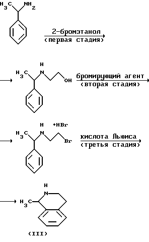 Реакционная схема 3![]() Все использованные в реакционной схеме 3 исходные продукты и реагенты являются известными соединениями и могут быть получены как промышленные продукты. На первой стадии -метилбензиламин взаимодействует с 2-бромэтанолом с получением N-(2-гидроксиэтил)- -метилбензиламин, который в свою очередь, взаимодействует с бромирующим агентом с получением гидробромида М-(2-бромэтил)- -метилбензиламина. На третьей стадии гидробромид N-(2-бромэтил)- -метилбензиламина взаимодействует с кислотой Льюиса с получением желаемого 1-метил-1,2,3,4-тетрагидроизохинолина формулы (III).