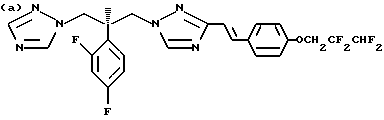 Пример 6. 2-(2,4-Дифторфенил)-1-{ 3-[(Е)-4- (2,2,3,3-тетрафторпропокси)стирил] -1H-1,2,4-триазол-1-ил} -3-(1H-1,2,4-триазол-1-ил)-2-пропилдигидрофосфат(а) (Дибензил) 2-(2,4-дифторфенил)-1-{3- [(Е)-4-(2,2,3,3-тетрафторпропокси) стирил] -1H-1,2,4-триазол-1-ил} -3- (1H-1,2,4-триазол-1-ил) -2-пропилфосфат (см. схему 10 в конце описания) 2-(2,4-Дифторфенил)-1-{ 3-[(E)-4-(2,2,3,3- тетрафторпропокси)стирил] -1H-1,2,4-триазол-1-ил} -3-(1H-1,2, 4-триазол-1-ил)пропан-2-ол (рацемат по примеру 19, ЕР 0472392, 475 мг, 0,88 ммоль), 1H-тетразол (185 мг, 2,64 ммоль) и дибензилдиизопропилфосфорамидит (607 мг, 1,76 ммоль) в метиленхлориде (5 мл) перемешивают при комнатной температуре в атмосфере азота в течение 20 часов. Затем смесь охлаждают до 0oC и добавляют по каплям перекись водорода (1,0 мл, 30% раствор в воде), поддерживая температуру ниже 20oC. Полученную смесь перемешивают при 20oC в течение 30 минут, затем отделяют органический слой, который промывают водой, сушат (MgSO4), и выпаривают растворитель. Полученное светло-желтое масло очищают методом колоночной хроматографии (силикагель, элюирование этилацетатом/гексаном), получая указанное в подзаголовке соединение в виде вязкого сиропа (595 мг, 84%). 1H ЯМР (300 МГц, CDCl3) = 4,37 (т, 2H), 4,91 (д, 2H), 4,97 (д, 2H), 5,02 (д, 1H), 5,07 (д, 1H), 5,16 (д, 1H), 5,18 (д, 1H), 6,05 (тт, 1H), 6,59-6,78 (м, 2H), 6,82 (д, 1H), 6,90 (д, 2H), 6,91-7,00 (м, 1H), 7,21-7,38 (м, 10H), 7,42 (д, 2H), 7,42 (д, 1H), 7,79 (с, 1H), 8,28 (с, 1H), 8,39 (с, 1H).