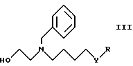 Экспериментальная частьПример 1 N-[-({2-(8-хинолилокси)этил}амино)бутил]бензамид (I, Ar = 8-хинолил, R = фенил, Y = -NHC (О)-: соединение N 5, таблица 1) Первая стадия N-[4-(бензил-(2-гидроксиэтил)амино)бутил] бензамид (III, R = фенил, Y = -NHC(О)-) Смесь N-бензилэтаноламина (60,5 г, 56,8 мл, 0,4 моль) и N-[4-(метансульфонилокси)бутил]бензамида (51,5 г, 0,19 моль) нагревают до 75-80oC в течение 2 часов в атмосфере азота. Реакционную смесь охлаждают, переносят в дихлорметан (400 мл), раствор промывают водой (3 х 100 мл), затем сушат над сульфатом магния. Раствор фильтруют и растворитель отгоняют при пониженном давлении с получением масла, которое кристаллизуют с диизопропиловым эфиром. Получают 51,5 г (83%) целевого соединения в виде белых кристаллов (т. пл. 61- 62oC). Вторая стадия N-[4-(бензил-(2-хлорэтил)амино)бутил] бензамид (IV, R = фенил, Y = -NHC(О)-) Метансульфонилхлорид (14,8 г, 10 мл, 0,13 моль) по каплям с перемешиванием добавляют в охлажденный раствор (5oC) N-[4{бензил (2-гидроксиэтил) амино) бутил] бензамида (35 г, 0,11 моль) в дихлорметане (300 мл). Раствору дают нагреться до комнатной температуры и, спустя 1,5 часа, добавляют триэтиламин (13 г, 18 мл, 0,13 моль), и продолжают перемешивание в течение 1,5 часов. Реакционную смесь промывают ледяной водой (150 мл), насыщенным водным раствором соли (2 х 100 мл) и сушат над сульфатом магния. После фильтрования и выпаривания растворителя при пониженном давлении получают 36,6 г (99%) целевого соединения в виде прозрачного бордового масла, которое кристаллизуется при хранении при 4oC. 1H ЯМР (CDCl3): 1,58-1,67 (м, 4H), 2,58 (м, 2H), 2,83 (т, 2H, J=6,8 Hz), 3,40-3,45 (кв. , 2H, J=6,5 Hz), 3,51 (т, 2H, J=6,8 Hz), 3,66 (с, 2H), 6,19 (с, 1H), 7,24-7,48 (м, 8H), 7,73- 7,75 (м, 2H). Третья стадия N-[4-бензил-(2-{ 8-хинолилокси)этил)амино)бутил] бензамид (V, Ar = 8-хинолил, R = фенил, Y = -NHC(О)-) Гидрид натрия (0,63 г, 16 ммоль) добавляют порциями при перемешивании к охлажденному раствору (5oC) 8-гидроксихинолина (2,3 г, 16 ммоль) в безводном диметилформамиде (80 мл). Раствор перемешивают в течение 30 минут при температуре окружающей среды (25oC), затем по каплям добавляют раствор N-[4-{бензил(2-хлорэтиламино} бутил] бензамида (5 г, 14 ммоль) в безводном диметилформамиде (80 мл). Реакционную смесь выдерживают при 60oC в течение 2 часов, затем растворитель выпаривают при пониженном давлении. Остаток переносят в дихлорметан (100 мл), затем промывают водой и сушат над безводным сульфатом магния. После фильтрования и выпаривания растворителя при пониженном давлении получают масло, которое очищают методом флэш хроматографии на силикагеле, используя в качестве элюента смесь этилацетат/гептан (2/1), получая 6,1 г (95 %) целевого соединения в виде масла. 1Н ЯМР (DMSO): 1,50-1-,70 (м, 4H), 2,54-2,61 (м, 2H), 2,93 (т, 2H, J=5 Hz), 3,24-3,30 (м, 2H), 3,73 (с, 2H), 4,25 (т, 2H, J=5 Hz), 7,00-7,60 (м = 10 H), 7,70-7,90 (м, 2H), 8,30 (дд, 1H, J1=2 Hz, J2=12 Hz), 8,45 (т, 2H, J=7 Hz), 8,85 (дд, 1H, J1=2 Hz, J2=4 Hz). Четвертая стадия N-[4-({2-(8-хинолилокси)этил}амино)бутил]бензамид Раствор хлорэтилхлорформиата (1,9 мл, 2,5 г, 17,5 ммоль) в сухом 1,2-дихлорэтане (10 мл) по каплям добавляют в раствор N-[4-{бензил[2- (8-хинолинокси) этил] амино} бутил] бензамида (4 г, 8,8 ммоль) в сухом 1,2-дихлорэтане (40 мл) в атмосфере азота при температуре 5oC. После нагревания при температуре 60oC в течение часа растворитель выпаривают при пониженном давлении, остаток переносят в метанол (40 мл) и в течение часа кипятят с обратным холодильником. Растворитель отгоняют при пониженном давлении, остаток переносят в смесь дихлорметана (50 мл) и воды (50 мл). Водную фазу отделяют и подщелачивают насы