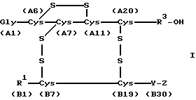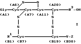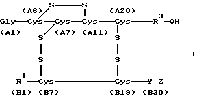 Изобретение относится к инсулину и его производным с повышенной способностью связывать цинк. Фармакинекокинетика введенного подкожно инсулина зависит от его ассоциативного поведения. Инсулин образует в нейтральном водном растворе гексамеры. Если инсулин хочет проникнуть из ткани в поток крови и попасть к месту, где он оказывает воздействие, то инсулин должен сначала миновать стенки капиллярных сосудов. Предполагают, что это возможно только для мономерного и для димерного инсулина – и невозможно или лишь слегка возможно для гексамерных инсулинов и высокомолекулярных ассоциатов (Brange et al., Diabetes Care: 13 (1990), страницы 923-954; Kang et al., Diabetes Care: 14 (1991), страницы 942-948). Поэтому диссоциация изомера является предпосылкой для быстрого перехода из подкожной ткани в поток крови. Ассоциативное и агрегатное поведение инсулина находится под влиянием цинка++, который приводит к стабилизации гексамера и при значениях pH вокруг нейтральной точки к образованию высокомолекулярных агрегатов вплоть до преципитации. Цинк++ в качестве добавки к незабуференному раствору инсулина человека (pH 4) оказывает лишь незначительное влияние на профиль действия. Несмотря на то что такой раствор после инъекции в подкожном слое ткани быстро нейтрализуется и образуются инсулиноцинковые комплексы, естественной способностью связывать цинк, которой обладает человеческий инсулин, недостаточно для того, чтобы стабилизировать гексамеры и высшие агрегаты. Поэтому благодаря добавке цинка++ освобождение человеческого инсулина замедляется незначительно и не достигается сильного эффекта продленного действия. Известные гексамеры инсулина показывают содержание около 2 моль цинка++ на моль гексамера инсулина (Blundell et al., Adv. Protein Chem.: 26 (1972), страницы 323-328). Два иона цинка на гексамер инсулина прочно связаны с гексамером инсулина и не могут быть удалены с помощью обычного диализа. Были описаны именно так называемые 4-цинк-инсулиновые кристаллы, однако эти кристаллы содержат в средстве только менее чем три моля цинка++ на моль гексамера (G.D. Smith et al., Proc. Natl. Acad. Sci. USA: 81, страницы 7093-7097). Задача настоящего изобретения состоит в том, чтобы найти производные инсулина, которые обладают повышенной способностью связывать цинк, образуют стабильный комплекс, содержащий гексамер инсулина и цинк++ и имеют замедленный профиль действия при подкожных инъекциях по сравнению с инсулином человека. Итак, были найдены инсулины формулы 1 ![]() и/или физиологически совместимые соли инсулинов формулы I, которые выполняют названные выше критерии и отличаются тем, что R1 представляет фенилаланиловый остаток или атом водорода, R3 представляет генетически кодируемый остаток аминокислоты, Y представляет генетически кодируемый остаток аминокислоты, Z означает а) остаток аминокислоты His или б) пептид с 2-35 генетически способными к кодированию остатками аминокислот, содержащими 1-5 гистидиновых остатка, а остатки А2-А20 соответствуют последовательности аминокислот А-цепи инсулина человека, животного инсулина или производному инсулина, а остатки B2-B29 соответствуют последовательности аминокислот B-цепи инсулина человека, животного инсулина или производному инсулина. В частности, предпочтительным является инсулин формулы I, где R1 означает фенилаланиновый остаток, R3 означает остаток аминокислоты из группы Asn, Gly, Ser