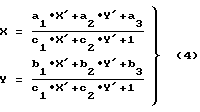 (57) Реферат: Изобретение относится к фотограмметрии и может быть использовано при ориентировании пары снимков. Измеряют соответствующие точки левого и правого снимков. Выполняют взаимное ориентирование снимков, при котором определяют элементы однородного проективного преобразования координат точек из системы правого снимка в систему координат левого снимка по соответствующим формулам. Производят трансформирование координат соответственных точек пары снимков и вводят в координаты точек левого и правого снимков поправки за рельеф. Выполняют внешнее ориентирование снимков. Способ позволяет обрабатывать снимки, полученные камерами с неизвестными или с переменными элементами внутреннего ориентирования. 1 табл. Изобретение относится к области фотограмметрии. Известен способ, позволяющий ориентировать одиночные снимки по плановым координатам точек местности [1]. В основе способа лежит однородное проективное преобразование координат точек снимка в систему координат местности, что позволяет трансформировать изображения без использования элементов внутреннего ориентирования. К недостаткам способа относится то, что он не позволяет учесть смещения точек на снимке, вызванные влиянием рельефа местности. Наиболее близким к предлагаемому заявлению является способ, основанный на приведении наклонных снимков к горизонтальным снимкам и внесении в координаты точек поправок за рельеф [2]. Приведение наклонных снимков к горизонтальным выполняется путем взаимного трансформирования пары снимков, включающего внутреннее ориентирование снимков, определение элементов взаимного ориентирования, трансформирование координат точек снимков, введение поправок за рельеф в положение точек на левом и правом снимке и внешнее ориентирование снимков в системе координат местности. К недостаткам способа относится то, что необходимость выполнять внутреннее ориентирование снимков остается. Для этого необходимо определять элементы внутреннего ориентирования с достаточно высокой точностью, что производится в процессе калибровки съемочной аппаратуры. Этот процесс легко выполняется для жестко фокусированных систем, какими являются топографические фотоаппараты. Но при съемке не метрическими фотоаппаратами или видеокамерами возникает необходимость изменения увеличения изображения за счет изменения фокусного расстояния. При этом не удается с необходимой точностью зафиксировать значение коэффициента трансфокации, а следовательно, не удается установить фактическое фокусное расстояние снимков. Поэтому данный способ неприменим, если в процессе съемки меняется фокусное расстояние съемочной камеры. Задачей изобретения является: – обеспечение обработки снимков с неизвестными элементами внутреннего ориентирования; – обеспечение обработки снимков с изменяющимися, в процессе съемки, элементами внутреннего ориентирования. Поставленная задача решается следующим путем: – производят измерения соответственных точек стереопары; – выполняют взаимное ориентирование пары снимков путем однородного проективного преобразования координат точек правого снимка из системы координат правого снимка в систему координат левого снимка; – вводят поправки в положение точек снимков, учитывающие влияние рельефа местности; – выполняют внешн
