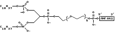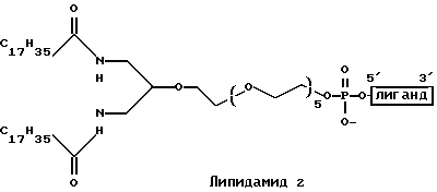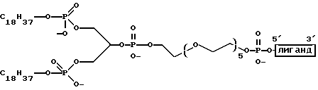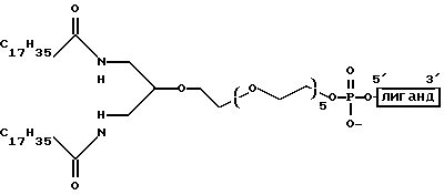 N, N’-Бис(стеароил)-2- (4,4′-диметокситритилокси)- гексаэтиленгликоль-1,3- диаминопропан (27). Раствор стеароилхлорида (3,363 г, 11,1 ммоль) в СlCН2СН2Сl вбрызгивали в раствор 26 в СlCН2СН2Сl и ТЭА (1,9 мл, 11,1 ммоль) с перемешиванием при комнатной температуре. Смесь выдерживали при комнатной температуре в течение 2 ч, затем нагревали до 70oС в течение ночи. После того как раствор охлаждали до комнатной температуры, этот раствор промывали 5% NаНСО3 и рассолом, высушивали над Na2SO4 и концентрировали в вакууме. Сырой продукт очищали с помощью влажной флэш-хроматографии на колонке с силикагелем в градиенте этилацетата и СН2Сl2 (50/50), а затем этилацетата и метанола (50/50). Вторую фракцию собирали, выпаривали и высушивали в вакууме с получением 27 (640 мг) в виде светло-желтого твердого вещества. 1H ЯМР (ДМСО-d6; , млн-1): 7.40 (d, J= 7.2 Гц, 2Н), 7.37-7.20 (m, 7H), 6.74 (d, J= 8.9 Гц, 4H), 3.71 (s, 6Н), 3.63-3.51 (m, 24 Н), 3.17 (s, 1Н), 3.16-3.13 (m, 4H), 2.12 (t, J= 7.3 Гц, 4H), 1.18 (m, 60H), 0.80 (t, J= 6.2 Гц, 6Н).