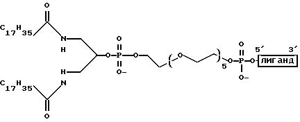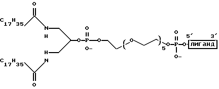 N, N’-Бис(стеароил)-2- (диизопропиламино-2- цианоэтоксифосфинилгексаэтиленгликоль)-1,3- диаминопропан (29). Соединение 28 (210 мг, 0,237 ммоль) высушивали в течение ночи в вакууме, растворяли в безводном CH2Cl2 (5,0 мл) и добавляли N, N-диизопропилэтиламин (218 мкл, 1,25 ммоль). Раствор охлаждали на ледяной бане и вбрызгивали хлор-(2-цианоэтокси)-N, N-диизопропиламино-фосфин (106 мкл, 0,47 ммоль). После перемешивания в течение 30 мин реакционную смесь разбавляли СН2Сl2 и промывали 5% NаНСО3 и рассолом, высушивали над Na2SO4 и концентрировали в вакууме с получением соединения 29. 31Р ЯМР (СDСl3, млн-1): 154.04.