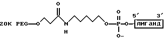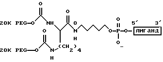 А-В-Y, где А – полиалкиленгликоль, имеющий структуру R(O(CH2)x)nO-, где R независимо выбран из группы, состоящей из Н и СН3, х= 2-5, а n MW (молекулярная масса) полиалкиленгликоля/ 16+14х;В – один или более линкеров, Y – РНК-лиганд к VEGF по п. 1. 3. Комплекс по п. 2, где указанный полиалкиленгликоль представляет собой полиэтиленгликоль. 4. Комплекс по п. 3, где указанный полиэтиленгликоль имеет молекулярную массу примерно 10-80К. 5. Комплекс по п. 3, где указанный полиэтиленгликоль имеет молекулярную массу примерно 20-45К. 6. Комплекс по п. 3, где указанный Комплекс представляет собой ![]() Лигандный компонент = fСmGmGrArAfUfCmAmGfUmGmAmAfUmGfCfUfUmAfUmAfCmAfUfCfCmG-3’3′-dT (лиганд VEGF) 7. Комплекс по п. 3, где указанный Комплекс представляет собой ![]() Лигандный компонент = fСmGmGrArAfUfCmAmGfUmGmAmAfUmGfCfUfUmAfUmAfCmAfUfCfCmG-3’3′-dT (лиганд VEGF) 8. Комплекс по п. 3, где указанный Комплекс представляет собой (см. графическую часть). Лигандный компонент = fСmGmGrArAfUfCmAmGfUmGmAmAfUmGfCfUfUmAfUmAfCmAfUfCfCmG-3’3′-dT (лиганд VEGF)7 9. Комплекс по п. 3, где указанный Комплекс представляет собой (см. графическую часть). Лигандный компонент = fСmGmGrArAfUfCmAmGfUmGmAmAfUmGfCfUfUmAfUmAfCmAfUfCfCmG-3’3′-dT (лиганд VEGF) 10. Комплекс по п. 3, где указанный Комплекс представляет собой (см. графическую часть). Лигандный компонент = fСmGmGrArAfUfCmAmGfUmGmAmAfUmGfCfUfUmAfUmAfCmAfUfCfCmG-3’3′-dT (лиганд VEGF). 11. Комплекс по п. 2, где указанная Нуклеиновая Кислота-Лиганд к VEGF была идентифицирована из Смеси Кандидатов Нуклеиновых Кислот согласно способу, при котором а) приводят в контакт Смесь Кандидатов с VEGF, причем Нуклеиновые Кислоты, обладающие повышенной аффинностью к VEGF относительно Смеси Кандидатов, можно отделить от остатка Смеси Кандидатов; б) отделяют Нуклеиновые Кислоты с повышенной аффинностью от остатка Смеси Кандидатов и в) амплифицируют Нуклеиновые Кислоты с повышенной аффинностью с получением смеси Нуклеиновых Кислот, обогащенной Нуклеиновыми Кислотами, обладающими повышенной аффиностью к VEGF, посредством чего получают Нуклеиновые Кислоты-Лиганды VEGF. 12. Комплекс по п. 11, где способ дополнительно включает в себя повторение стадий (б) и (в). 13. Комплекс, имеющий формулу А-В-Y, где А представляет собой глицеринлипид, имеющий структуру ![]() где R1 и R2 – СН3(СН2)n-О(РО3)-СН2-; СН3(СН2)n-СОNН2-СН2-, СН3(СН2)nО-, СН3(СН2)nОСН2-, где n= 10-20; R3 представляет собой -Х-, где -Х- выбран из группы, состоящей из -(РО4)-, -О- и -СН2ОС(О)-; В – один или более линкеров; Y – РНК-лиганд к VEGF по п. 1. 14. Комплекс по п. 13, где указанный глицеринлипид представляет собой фосфолипид, где по меньшей мере один из 1 и R2 – СН3(СН2)n-О(РО3)-СН2-. 15. Комплекс по п. 14, где R1 – СН3(СН2)n-О(РО3)-СН2-, R2 – СН3(СН2)n-О(РО3)-СН2-, а n= 17. 16. Комплекс по п. 15, где -Х- представляет собой -(РО4)-. 17. Комплекс по п. 13, где указанный глицеринлипид представляет собой глицеринамидлипид, где по меньшей мере один из R1 и R2 – СН3(СН2)n-СОNН2-СН2-. 18. Комплекс по п. 17, где R1 – СН3(СН2)n-СОNН2-СН2-, R2 – СН3(СН2)n-СОNН2-СН2-, а n= 16. 19. Комплекс по п. 18, где -Х- представляет собой -(РО4)-. 20. Комплекс по п. 18, где -Х- представляет собой -О-. 21. Комплекс по п. 13, где R1 – СН3(СН2)n-О-, R2 – СН3(СН2)n-ОСН2-, R3 – СН2ОС(О)- и n= 17. 22. Комплекс по п. 13, где указанная Нуклеиновая Кислота-Лиганд к VEGF была идентифицирована из Смеси Кандидатов Нуклеиновых Кислот согласно способу, при котором а) приводят в контакт Смесь Кандидатов с VEGF, причем Нуклеиновые Кислоты, обладающие повышенной аффинностью к VEGF относительно Смеси Кандидатов, можно отделить от остатка Смеси Кандидатов; б) отделя