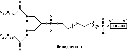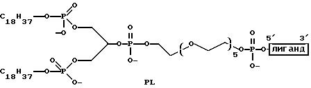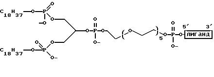 1-Диметокситритил-3- (фталимидотетраэтиленгликолил)-sn- глицерин (9):Согласно схеме 1 соединение 9 синтезировали следующим образом: К перемешанному раствору 4а (10,13 г, 0,0279 моль) в 100 мл ацетона и 1 мл Н2О добавляли 3,98 г (1,22 эквив. ) N-метилморфолин-N-оксида (NMO). К этой суспензии добавляли 1,75 мл (0,005 эквив. ) тетраоксида осмия в виде 2,5% раствора в изопропаноле (iPrOH). После добавления раствора OsO4 реакционная смесь становилась чисто желтой. После того как ТСХ-анализ показывал полное превращение 4а (примерно 16 ч), реакционную смесь обрабатывали 1,5 г гидросульфита натрия и 5,0 г флорисила и перемешивали в течение 30 минут. Суспензию фильтровали через флорисил, фильтрат концентрировали до масла. Этот сырой продукт объединяли с другой партией, полученной тем же способом из 1,0 г 4а. Две части по 100 мл пиридина совместно выпаривали с объединенными партиями, и остаток растворяли в 300 мл пиридина. Раствор охлаждали до 0oС и добавляли 10,89 г (1,05 эквив. ) 4,4′-диметокситритилхлорида. В колбу вставляли сушильную трубку, и реакционную смесь перемешивали при комнатной температуре в течение 16 ч. Раствор обрабатывали 20 мл МеОН и концентрировали в вакууме, держа температуру водяной бани ниже 40oС. Сырое масло очищали с помощью флэш-хроматографии с использованием 1100 мл силикагеля (упакованного в колонку влажным с использованием 3% триэтиламина в гексане) и элюции 10-100% ЕtOАс в гексане (все содержащие 3% триэтиламин) с получением 21,3 г (89% после двух стадий) 9 в виде желтого масла. 1H ЯМР (300 МГц, СDСl3) d 7.80-7.77 (m, 2H), 7.66-7.64 (m, 2H), 7.39-7.22 (m, 9H), 7.20-6.76 (m, 4H), 3.97 (bs, 1H), 3.84 (t, J= 5.97 Гц, 2H), 3.74 (s, 6H), 3.68 (t, J= 5.7 Гц, 2H), 3.60-3.49 (m, 14H), 3.13-2.76 (m, 2H), 2.00 (bs, 1H); 13C ЯМР (75 МГц, CDCl3) d 168.2, 158.3, 144.8, 135.9, 133.8, 132.0, 129.9, 128.0, 127.7, 126.6, 123.1, 113.0, 85.9, 73.0, 70.6, 70.4, 70.0, 69.7, 67.8, 64.4, 55.1, 37.1; МС низкого разрешения, m/e, вычисленный для C40H45O10N (M+NH4 +): 717.5. 1-Диметокситритил-3- (аминотетраэтиленгликолил)-sn- глицерин (10): Согласно схеме 1 соединение 10 синтезировали следующим образом: Соединение 9 (5,2 г, 7,2 ммоль) растворяли в 50 мл 40% метиламина в Н2О и добавляли 10 мл метанола для солюбилизации исходного материала. Реакционную смесь нагревали при 50oС в течение 5 ч, а затем концентрировали в вакумме и выпаривали вместе с толуолом. Сырой материал очищали с помощью флэш-хроматографии на 200 мл силикагеля, элюируя 15% метаноламмиаком в дихлорметане. Собирали 3,94 г (96%) 10 в виде светло-желтого масла. 1H ЯМР (300 МГц, СDСl3) d 7.46-7.21 (m, 9H, DMT), 6.81 (d, 4H, DMT), 4.00 (m, 1H), 3.80 (s, 6H), 3.70-3.49 (перекрывающийся, 18Н), 3.20 (dd, J= 9.24, 5.49 Гц, 1H), 3.12 (dd, J= 9.21, 6.00 Гц, 1H), 2.84-2.80 (m, 3H); 13С ЯМР (75 МГц, CDCl3) d 158.30, 144.82, 136.01, 129.95, 128.04, 127.66, 126.61, 112.95, 85.85, 73.46, 72.85, 70.55, 70.45, 69.99, 69.51, 64.43, 55.10, 41.40; МС низкого разрешения, m/e, вычисленный для С32Р44O8N (М+1): 570.353, обнаружено 570,4. Хлорформиат 19: К перемешанному раствору 3 г (5,03 ммоль) 1,2-ди-О-октадецил-sn-глицерина 18 в 60 мл толуола добавляли 20 мл 1,93 М раствора фосгена. Дополнительный раствор фосгена (2 10 мл: 14,5 эквив. фосгена всего) добавляли до тех пор, пока исходного спиртового раствора больше не оставалось (по 1H ЯМР анализу концентрированных аликвот). Избыток фосгена и HCl удаляли с помощью аспиратора, и реакционную смесь концентрировали в вакууме с получением 3,3 г (98%) желаемого хлорформиата 19 в виде белого порошка. 1H ЯМР (300 МГц, CDCl3) d 4.45 (dd, J= 11.22, 3.69 Гц, 1H), 4.34 (dd, J= 11.22, 6.15 Гц, 1Н), 3.65 (m, 1H), 3.56-3.40 (m, 6H), 1,53 (m, 4H), 1.24 (m, 62H), 0.87 (t, J= 6.36 Гц, 6H); 13С ЯМР (75 МГц, СDСl3) d 75.90, 71.91, 71.35, 70.93, 69.36, 31.99, 29.96-29.44 (перекрывающиеся сигналы от углеводородных цепей), 26.13, 26.04, 22.76, 14.18.