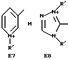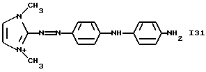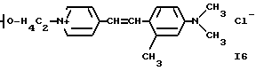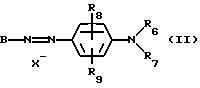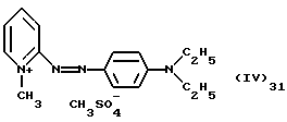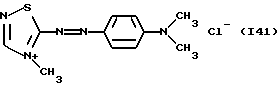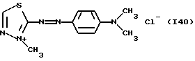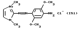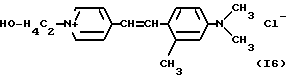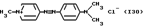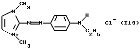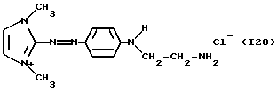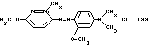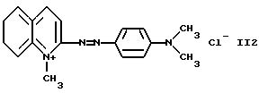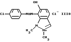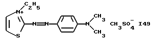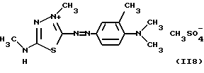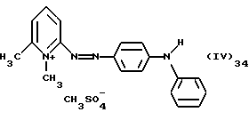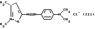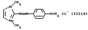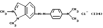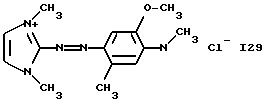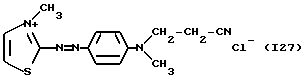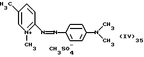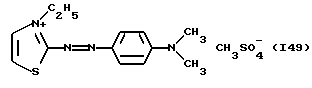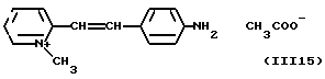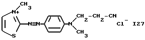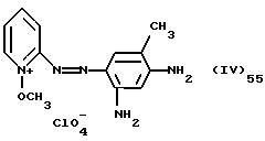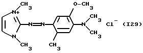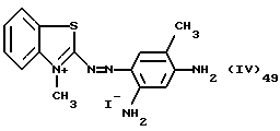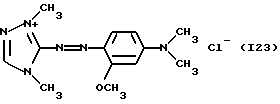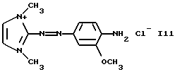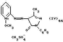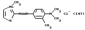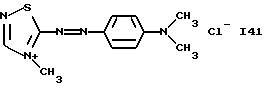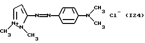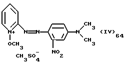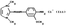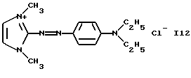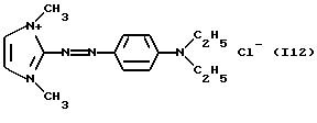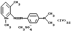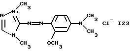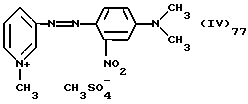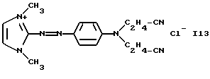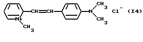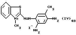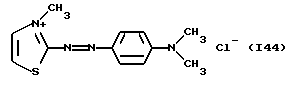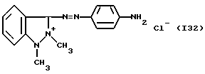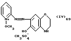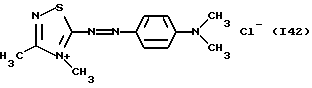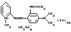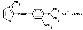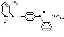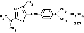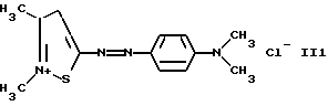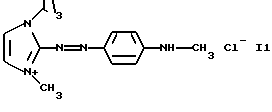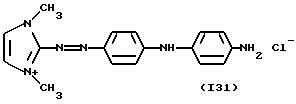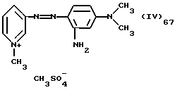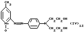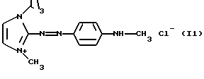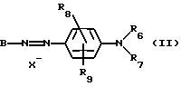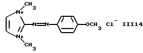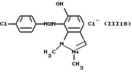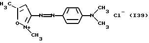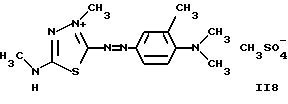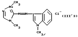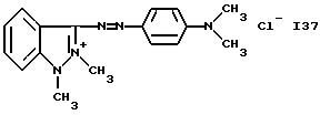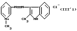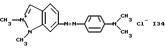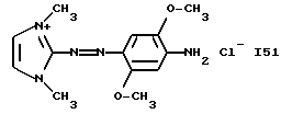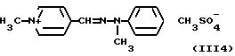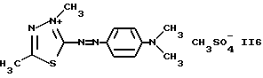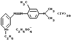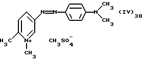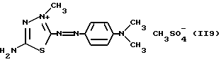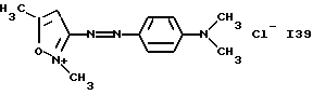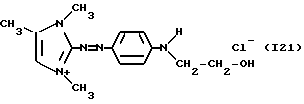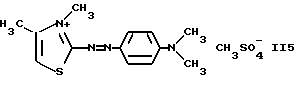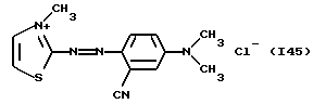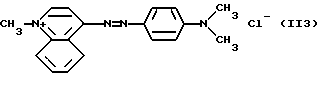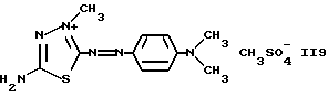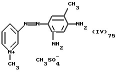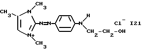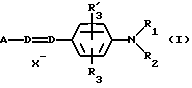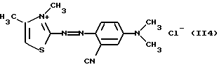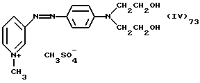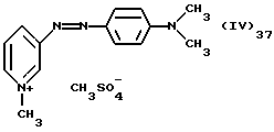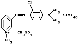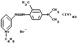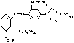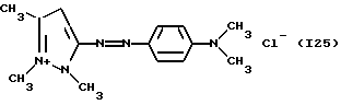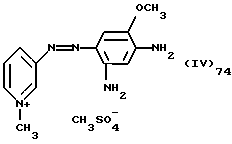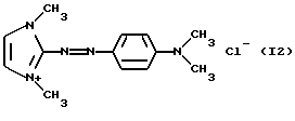 а) Соединения приведенной ниже формулы I ![]() в которой D обозначает атом азота или группу -СН, R1 и R2 одинаковые или разные, обозначают атом водорода: С1-С4-алкил, который может быть замещен радикалом -CN, -ОН или -NH2; или образуют вместе с атомом углерода бензольного цикла гетероцикл, который может быть кислород- или азотсодержащим и который может быть замещен одним или несколькими С1-С4-алкилами или радикал 4′-аминофенил; R3 и R’3, одинаковые или разные, обозначают атом водорода или галогена, выбранный из хлора, брома, йода или фтора; цианогруппу, С1-С4-алкил, С1-С4-алкокси- или ацетилоксигруппу; Х– обозначает анион, преимущественно выбранный из хлорида, метилсульфата и ацетата; А обозначает группу, выбранную из групп с приведенными ниже структурами А1-А19; ![]() ![]() ![]() ![]() ![]() ![]() ![]() ![]() ![]() ![]() в которых R4 обозначает С1-С4-алкил, который может быть замещен гидроксилом, и R5 обозначает радикал С1-С4-алкокси при условии, что когда D обозначает -СН, А обозначает А4 или А13 и R3 отличен от алкоксигруппы, то R1 и R2 не являются одновременно атомами водорода; b) Соединения приведенной ниже формулы II ![]() в которой R6 обозначает атом водорода или С1-С4-алкил; R7 обозначает атом водорода, алкил, который может быть замещен радикалом – СN или аминогруппой; радикал 4′-аминофенил; или вместе с R6 образует гетероцикл, который может быть кислород- и/или азотсодержащим и который может быть замещен С1-С4-алкилом; R8 и R9, одинаковые или разные, обозначают атом водорода или галоген, такой как хлор, бром, иод или фтор; С1-С4-алкил, С1-С4-алкокси или радикал -СN; Х– обозначает анион, преимущественно выбранный из хлорида, метилсульфата и ацетата; В обозначает группу, выбранную из групп с приведенными ниже структурами В1-В6; ![]() ![]() ![]() ![]() в которых R10 обозначает С1-С4-алкил, а R11 и R12, одинаковые или разные обозначают атом водорода или С1-С4-алкил; с) Соединения приведенных ниже формул III и III’ ![]() ![]() в которой R13 обозначает атом водорода, радикал С1-С4-алкокси, атом галогена (бром, хлор, иод или фтор) или аминогруппу; R14 обозначает атом водорода, радикал С1-С4-алкил или образует вместе с атомом углерода бензольного цикла гетероцикл, который может быть кислородсодержащим и/или замещенным одним или несколькими С1-С4-алкилами; R15 обозначает атом водорода или галоген (бром, хлор, иод или фтор); R16 и R17, одинаковые или разные, обозначают атом водорода или С1-С4-алкил; D1 и D2, одинаковые или разные, обозначают атом азота или группу -СН; m = 0 или 1; при условии, что, когда R13 обозначает незамещенную аминогруппу, то D1 и D2 одновременно обозначают группу -СН, а m = 0; Х– обозначает анион, преимущественно выбранный из хлорида, метилсульфата и ацетата; Е обозначает группу, выбранную из приведенных ниже структур Е1-Е8; ![]() ![]() ![]() ![]() ![]() в которых R’ обозначает С1-С4-алкил; когда m = 0 и D1 обозначает атом азота, то Е может также обозначать приведенную ниже структуру Е9: ![]() в которой R’ обозначает С1-С4-алкил; d) Соединения приведенной ниже формулы IV G-N= N-J (IV), в которой G обозначает группу, выбранную из приведенных ниже структур G1-G3: ![]() ![]() ![]() в которых R18 обозначает С1-С4-алкил, фенил, который может быть замещен С1-С4-алкилом, или атом галогена, (бром, хлор, иод или фтор); R19 обозначает С1-С4-алкил или фенил; R20 и R21, одинаковые или разные, обозначают С1-С4-алкил, фенил или вместе образуют в G1 бензольный цикл, замещенный одним или несколькими С1-С4-алкилами, С1-С4-алкокс