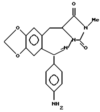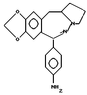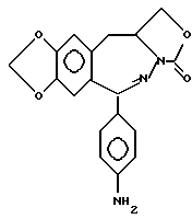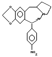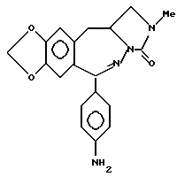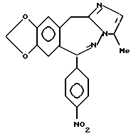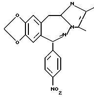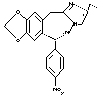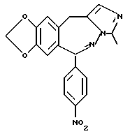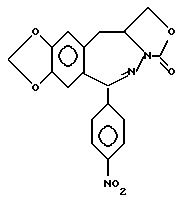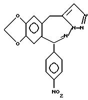 Получение исходных соединенийI) 8-гидроксиметил-7-метилкарбамоил-5-(4-нитрофенил)-8,9-дигидро-7Н-1,3-диоксоло[4,5-h] [2,3] бензодиазепин А. 8-формил-5-(4-нитрофенил)-9Н-1,3-диоксоло[4,5-h] [2,3] бензодиазепин 1,0 г (3,1 ммоль) 8-метил-5-(4-нитрофенил)-9Н-1,3-диоксоло[4,5-h] [2,3] бензодиазепина (French Patent 2566774) растворяют при 90oС в 15 мл ДМФ. Добавляют 0,38 г (3,4 ммоль) SeO2 и перемешивают в течение 40 минут при 90oС. После отфильтровывания твердых веществ продукт осаждают 100 мл воды, неочищенный продукт отфильтровывают, промывают водой и сушат. Получают 1,04 г соединения. После очистки колоночной хроматографией (силикагель, элюент бензол/этилацетат 20: 1) и последующего суспендирования кристаллического соединения в этаноле получают 0,52 г (50%) продукта. Точка плавления 228-230oС (разложение). В. 8-гидроксиметил-5-(4-нитрофенил)-8,9-дигидро-7Н-1,3-диоксоло[4,5-h] [2,3] бензодиазепин Суспензию 7,0 г (20,7 ммоль) полученного согласно стадии А альдегида в 420 мл этанола охлаждают при перемешивании до 20oС и смешивают с 7,84 г (0,21 моль) NaBH4. Реакционную смесь нагревают в течение 1 часа до кипения, затем смешивают с активированным углем и проводят фильтрование при нагревании. Растворитель удаляют, остаток помещают в дихлорметан, обрабатывают и получают 6,37 г (90%) неочищенного продукта, который очищают колоночной хроматографией на силикагеле со смесью бензол/этилацетат 1: 1 в качестве элюента. Получают 5,46 г (77%) чистого продукта с точкой плавления 132-134oС. С. 8-гидроксиметил-7-метилкарбамоил-5-(4-нитрофенил)-8,9-дигидро-7Н-1,3-диоксоло[4,5-h] [2,3] бензодиазепин 1,0 г (2,9 ммоль) полученного согласно стадии В спирта растворяют в 40 мл дихлорметана и смешивают с 0,5 мл (8,8 ммоль) метилизоцианата. Раствор оставляют стоять в течение 3 дней при комнатной температуре и затем концентрируют. Кристаллический остаток суспендируют в 10 мл этанола и нагревают до кипения. Получают 1,02 г (87%) желтого продукта с точкой плавления 242-243oС (разложение). II) 5-(4-аминофенил)-8-гидроксиметил-7-метилкарбонил-8,9-дигидро-7Н-1,3-диоксоло[4,5-h] [2,3] бензодиазепин Суспензию 1,02 г (2,56 ммоль) 8-гидроксиметил-7-метил-карбамоил-5-(4-нитрофенил)-8,9-дигидро-7Н-1,3-диоксоло[4,5-h] [2,3] бензодиазепина (Стадия С) в 40 мл этанола смешивают при перемешивании с 0,45 мл (9 ммоль) 98% гидразингидрата и катализатором Ренея (RaNi). Спустя 30 минут катализатор отфильтровывают и раствор концентрируют. Остаток перекристаллизовывают в этаноле и получают 0,83 г (88%) продукта с точкой плавления 136-138oС. III) 8-гидроксиметил-5-(4-нитрофенил)-9Н-1,3-диоксоло[4,5-h] [2,3] бензодиазепин 2,5 г (7,41 ммоль) 8-формил-5-(4-нитрофенил)-9Н-1,3-диоксоло[4,5-h] [2,3] бензодиазепина (I, Стадия А) суспендируют в смеси ТГФ: вода 1: 1 и при перемешивании и охлаждении до 20oС смешивают с 0,14 г (3,7 ммоль) бораната натрия. Спустя 45 минут раствор фильтруют и из фильтрата осаждают неочищенный продукт 130 мл воды. Получают 2,35 г продукта, который перекристаллизовывают из смеси 6,3 мл диметилформамида и 1,3 мл воды. Получают 1,97 г (78%) соединения заголовка с точкой плавления 175oС (разложение). Пример 1 9-метил-5-(4-нитрофенил)-11Н-1,3-диоксоло[4,5-h] имидазо[3,4-с] [2,3] бензодиазепин-8,10(9Н, 10аН)-дион ![]() А. 5-(4-нитрофенил)-9Н-[1,3-] диоксоло[4,5-h] [2,3] бензодиазепин-8-карбоновая кислота К раствору 3,0 г AgNO3 в воде (50 мл) добавляют 42 мл 4%, раствора NaOH. К гетерогенной смеси медленно добавляют раствор 3,0 г 8-формил-5-(4-нитрофенил)-9Н-1,3-диоксоло[4,5-h] [2,3] бензодиазепина в 120 мл диоксана и реакционную смесь перемешивают в течение 30 мину