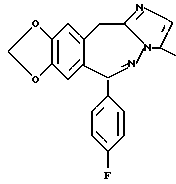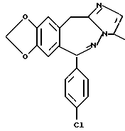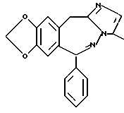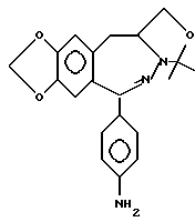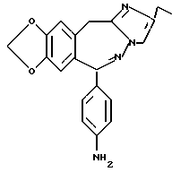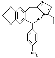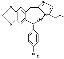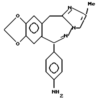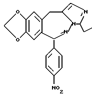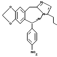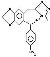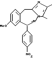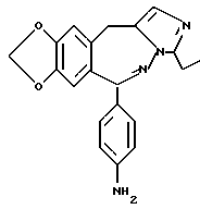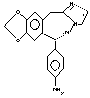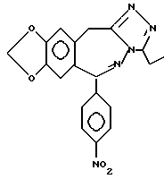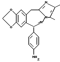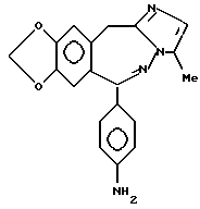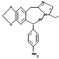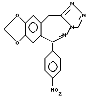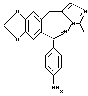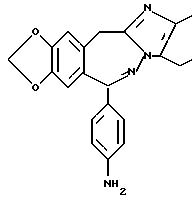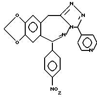 5-(4-нитрофенил)-7Н-1,3-диоксоло[4,5-h] [2,3] бензодиазепин-8(9Н)-тион6,5 г (20,0 ммоль) полученного согласно стадии С соединения и 7,6 г (30,0 ммоль) пентасульфида фосфора нагревают в 100 мл пиридина до 80oС. Спустя 1,5 часа реакционную смесь выливают в 400 мл воды и рН раствора доводят до 6,5 уксусной кислотой. Осадок отфильтровывают, промывают и сушат. Получают 4,36 г (64%) продукта, точка плавления 257-258oС (ацетон). Аналогичным образом получают согласно стадиям A-D: 5-(4-хлорфенил)-7Н-1,3-диоксоло[4,5-h] [2,3] бензодиазепин-8(9Н)-тион, 5-(4-фторфенил)-7Н-1,3-диоксоло[4,5-h] [2,3] бензодиазепин-8(9Н)-тион, 5-(2-фторфенил)-7Н-1,3-диоксоло[4,5-h] [2,3] бензодиазепин-8(9Н)-тион, 5-(3-хлорфенил)-7Н-1,3-диоксоло[4,5-h] [2,3] бензодиазепин-8(9Н)-тион, 5-(2-хлорфенил)-7Н-1,3-диоксоло[4,5-h] [2,3] бензодиазепин-8(9Н)-тион, 5-фенил-7Н-1,3-диоксоло[4,5-h] [2,3] бензодиазепин-8(9Н)-тион. Е. 8-(метилтио)-5-(4-нитрофенил)-9Н-1,3-диоксоло[4,5-h] [2,3] бензодиазепин 2,2 г (6,45 ммоль) полученного согласно стадии D соединения растворяют в 500 мл ацетона и смешивают с 2,22 г 2CO3 и 2 мл (32 ммоль) метилиодида. Смесь перемешивают приблизительно в течение 2 дней, выливают в воду, отделяют осадок и промывают его водой. После высушивания получают 2,0 г (87%) продукта, точка плавления 280-281oС. Аналогично получают: 5-(2-фторфенил)-8-(метилтио)-9Н-1,3-диоксоло[4,5-h] [2,3] бензодиазепин 5-(3-хлорфенил)-8-(метилтио)-9Н-1,3-диоксоло[4,5-h] [2,3] бензодиазепин 5-(2-хлорфенил)-8-(метилтио)-9Н-1,3-диоксоло[4,5-h] [2,3] бензодиазепин 8-(метилтио)-5-фенил-9Н-1,3-диоксоло[4,5-h] [2,3] бензодиазепин F. 5-(4-нитрофенил)-8-метил-11Н-1,3-диоксоло[4,5-h] [1,2,4] триазоло[4,3-с] [2,3] бензодиазепин 0,53 г (1,50 ммоль) полученного согласно стадии Е соединения, 0,22 г (3,0 ммоль) гидразида уксусной кислоты и 0,1 г п-толуолсульфокислоты нагревают при перемешивании до 120oС. Спустя 45 минут реакционную смесь выливают в воду, осадок отделяют, промывают водой и сушат. Получают 0,45 г (83%) продукта, точка плавления 292-294oC (разложение). Пример 16 5-(4-аминофенил)-8-метил-11Н-1,3-диоксоло[4,5-h] [1,2,4] триазоло[4,3-с] [2,3] бензодиазепин ![]() 0,45 г полученного согласно Примеру 15 нитросоединения в метаноле восстанавливают аналогично примеру 2 со смесью RaNi/гидразингидрат и получают 0,40 г (97%) продукта, точка плавления 278-280oС (этанол). Пример 17 5-(4-нитрофенил)-8-этил-11Н-1,3-диоксоло[4,5-h] [1,2,4] -триазоло[4,3-с] [2,3] бензодиазепин ![]() Аналогично Примеру 15 получают продукт согласно стадии F с гидразидом пропионовой кислоты. Выход 71%, точка плавления 234-235oС. В основном аналогично получают: 5-(4-нитрофенил)8-пропил-11Н-1,3-диоксоло[4,5-h] -[1,2,4] триазоло[4,3-с] [2,3] бензодиазепин (Т. пл. 124-126oС), 5-(4-нитрофенил)-8-циклопропил-11Н-1,3-диоксоло[4,5-h] -[1,2,4] триазоло[4,3-с] [2,3] бензодиазепин (Т. пл. 154-156oС), 5-(4-нитрофенил)-8-н-бутил-11Н-1,3-диоксоло[4,5-h] -[1,2,4] триазоло[4,3-с] [2,3] бензодиазепин (Т. пл. 124-125oС), 5-(4-нитрофенил)-8-метоксиметил-11Н-1,3-диоксоло[4,5-h] [1,2,4] триазоло[4,3-с] [2,3] бензодиазепин (Т. пл. 142-143oС), 5-(4-хлорфенил)-8-метил-11Н-1,3-диоксоло[4,5-h] [1,2,4] триазоло[4,3-с] [2,3] бензодиазепин, 5-(3-хлорфенил)-8-метил-11Н-1,3-диоксо[4,5-h] [1,2,4] -триазоло[4,3-с] [2,3] бензодиазепин, 5-(4-фторфенил)-8-метил-11Н-1,3-диоксоло[4,5-h] [1,2,4] -триазоло[4,3-с] [2,3] бензодиазепин, 8-метил-5-фенил-11Н-1,3-диоксоло[4,5-h] [1,2,4] триазоло[4,3-с] [2,3] бензодиазепин, 8-этил-5-фенил-11Н-1,3-диоксоло[4,5-h] [1,2,4] триазоло[4,3-с] [2,3] бензодиазепин, 8-циклопропил-5-фенил-11Н-1,3-диоксоло[4,5-h] [1,2,4] -триазоло[4,3-с] [2,3] бензодиазепин, 8-(4-нитрофенил)-5-фенил-11Н-1,3-диоксоло[4,5-h] -[1,2,4] триазоло[4,3-с] [2,3] бензодиазепин. Пример 18 5-(4-аминофенил)-8-этил-11Н-1,3-диоксоло[4,5-h] [1,2,4] -триазоло[4,3-с] [2,3] б