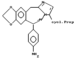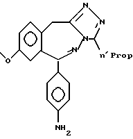 Пример 245-(4-аминофенил)-8-(трифторметил)-11Н-1,3-диоксоло[4,5-h] [1,2,4] триазоло[4,3-с] [2,3] бензодиазепин ![]() Полученное согласно Примеру 23 нитросоединение восстанавливают аналогично Примеру 2. Выход 68%, точка плавления 206-208oС (метанол). Пример 25 5-(4-нитрофенил)-11Н-1,3-диоксоло[4,5-h] имидазо[1,2-с] -[2,3] бензодиазепин ![]() 0,53 г (1,50 ммоль) полученного в Примере 15Е метилтиопроизводного нагревают до 120oС с 0,10 г п-толуолсульфокислоты и 0,32 г (3,00 ммоль) аминоацетальдегиддиметилацеталя. После 10 часов реакционную смесь выливают в воду и осадившееся промежуточное соединение отфильтровывают. Это соединение растворяют в 20 мл смеси концентрированной НСl и этанола 1: 1 и нагревают в течение 4 часов до кипения. После охлаждения получают гидрохлорид целевого соединения при помощи фильтрования. Выход 0,32 г (55%), точка плавления 237-239oС. По существу аналогичным образом получают 5-фенил-11Н-1,3-диоксоло[4,5-h] имидазо[1,2-с] [2,3] бензодиазепин. Пример 26 5-(4-аминофенил)-11Н-1,3-диоксоло[4,5-h] имидазо[l, 2-с] [2,3] бензодиазепин ![]() Полученное в Примере 25 нитросоединение восстанавливают аналогично Примеру 3. Выход 0,2 г (76%), точка плавления 264-265oС (этанол). Пример 27 6-(4-аминофенил)-8-метокси-3-пропил-11Н-[1,2,4] триазоло[4,3-с] [2,3] бензодиазепин ![]() А. 3,90 г (10,0 ммоль) 7-бром-8-метокси-1-(4-нитрофенил)-4,5-дигидро-3Н-2,3-бензодиазепин-4-она растворяют в безводном пиридине и смешивают с пентасульфидом фосфора (5,70 г 25,6 ммоль). После 2 часов при 80oС смесь выливают на 450 г льда и перемешивают в течение 1 часа. Выпавшие кристаллы фильтруют и промывают водой. После перекристаллизации из ацетонитрила получают 2,88 г (71%) 7-бром-8-метокси-1-(4-нитрофенил)-4,5-дигидро-3Н-2,3-бензодиазепин-4-тиона с точкой плавления 245-247oС. В. 2,84 г (7,0 ммоль) соединения из стадии А растворяют в 10 мл безводного ДМФ и 100 мл ацетона и после добавления 1,93 г (14,0 ммоль) карбоната калия и 1,75 мл (28,0 ммоль) метилиодида смесь перемешивают при комнатной температуре в течение 20 часов. Затем ацетон сливают и остаток помещают в 80 мл воды. Выпавшие кристаллы отсасывают и промывают водой. Неочищенный продукт перекристаллизовывают дважды из ацетонитрила. Получают 1,68 г (57%) 7-бром-8-метокси-4-метилтио-1-(4-нитрофенил)-5Н-2,3-бензодиазепина с точкой плавления 225-227oС. С. 1,17 г (2,78 ммоль) соединения из стадии В растворяют в 40 мл безводного ДМФ и смешивают с 0,73 г (8,4 ммоль) гидразида масляной кислоты, а также 3 каплями концентрированной НСl. Смесь перемешивают в течение 5 часов при 110-115oС. Затем смесь выливают на лед (160 г) и перемешивают в течение 1 часа. Выпавшие кристаллы отсасывают и промывают водой. Получают 1,05 г (83%) 9-бром-6-(4-нитрофенил)-8-метокси-3-пропил-11Н-[1,2,4] триазоло[4,3-с] [2,3] бензодиазепина с точкой плавления 238-240oС. Аналогично получают: 8-метокси-3-метил-6-(4-нитрофенил)-11Н-[1,2,4] триазоло-[4,3-с] [2,3] бензодиазепин, 3-этил-8-метокси-6-(4-нитрофенил)-11Н-[1,2,4] триазоло-[4,3-с] [2,3] бензодиазепин, 3-циклопропил-8-метокси-6-(4-нитрофенил)-11Н-[1,2,4] -триазоло[4,3-с] [2,3] бензодиазепин. D. 1,0 г (2,2 ммоль) соединения из стадии С растворяют в смеси 80 мл метанола и 3 мл воды и после добавления 0,8 г 10% Pd/C в качестве катализатора и 0,30 г (2,2 ммоль) карбоната калия гидрируют в течение ~ 15 часов. Затем катализатор отсасывают и фильтрат концентрируют. Неочищенный продукт перекристаллизовывают из этилацетата (3 мл) и получают 0,44 г (58%) 6-(4-аминофенил)-8-метокси-3-пропил-11Н-[1,2,4] триазоло[4,3-с] [2,3] бензодиазепина с точкой плавления 192-194oС. В основном аналогичным обра