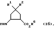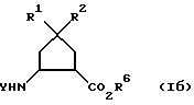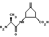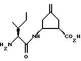 С25Н26N2O5(434,5)Целевые продукты Пример 1 (+)-1,2-цис-2-(S)-изолейцил-амино-4-метиленциклопентан-1-карбоновая кислота ![]() Раствор соединения из примера I (24,0 г, 0,050 моля) в пиперидине (200 мл) перемешивали при комнатной температуре в течение 1 часа. По окончании реакции пиперидин отгоняли в вакууме. Остаток поглощали водой. После нескольких экстракций диэтиловым эфиром водную фазу концентрировали при добавлении толуола в вакууме. Продукт кристаллизовали из смеси изопропанол/диэтиловый эфир. Выход: 8,5 г (67% от теории). Точка плавления: 198oС [ ]20D=+23,9 (с=1,08 в воде)1Н-ЯМР (250 МГц, D2O): = 0,70-0,88(м, 6Н); 0,91-1,18, 1,19-1,43, 1,53-1,72 (3м, 3Н); 2,23-2,67 (м, 4Н); 2,88 (сим.м, 1Н); 3,28 (д, 1Н); 4,30 (сим.м, 1Н); 4,85 (сим.м, 2Н).