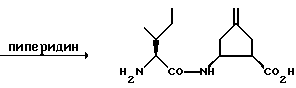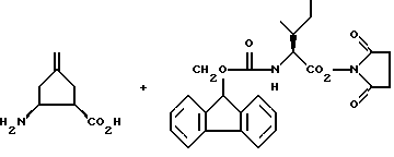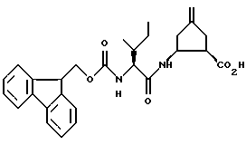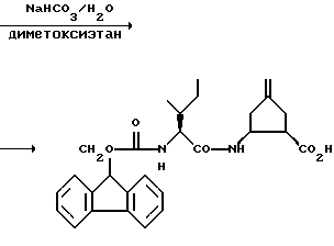 Исходные соединенияПример I (-)-1,2-цис-2-(N-(9-флуоренилметилоксикарбонил)-(S)-изолейцил)-амино-4-метилен-циклопентан-1-карбоновая кислота ![]() К раствору (-)-1,2-цис-2-амино-4-метилен-циклопентан-1-карбоновой кислоты (35,1 г, 0,198 моля) и бикарбоната натрия (33,36 г, 0,397 моля) в 480 мл воды при комнатной температуре прикапывали раствор сложного эфира N-(9-флуоренил-метилоксикарбонил)-(S)-изолейцина и имида оксиянтарной кислоты (89,2 г, 0,198 моля) в 600 мл диметоксиэтана. Смесь перемешивали в течение ночи при комнатной температуре. Затем исходную реакционную смесь подкисляли разбавленной соляной кислотой до рН 2 и несколько раз экстрагировали диэтиловым эфиром. Объединенные органические фазы высушивали над сульфатом натрия и концентрировали в вакууме. Продукт кристаллизовали из смеси диэтиловый эфир/петролейный эфир. Выход: 70 г (74% от теории). Точка плавления: 207oС [ ]20D = -24,1(с=1,15 в хлороформе)1Н-ЯМР (250 МГц, CDCl3): = 0,88(сим. м, 6Н); 0,98-1,15, 1,40-1,51, 1,52-1,80 (3м, 3Н); 2,40-2,84 (м, 4Н); 3,12 (сим. м. 1Н); 4,10-4,48 (м, 4Н); 4,61 (сим. м, 1Н); 4,90 (сим.м, 2Н); 5,84 (д, 1Н); 7,20-7,80 (3м, 9Н).