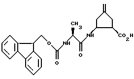 C28H32N2O5 (476,6)Пример II 1,2-цис-2-(N-(9-флуоренилметилоксикарбонил)-(S)-аланил)-амино-4-метиленциклопентан-1-карбоновая кислота ![]() Указанное выше соединение получали аналогично описанному в примере I с использованием (-)-1,2-цис-2-амино-4-метиленциклопентан-1-карбоновой кислоты (2,27 г, 16,1 ммолей), сложного эфира N-(9-флуоренилметилоксикарбонил)-(8)-аланина и имида оксиянтарной кислоты (7,0 г, 17,2 ммолей) и бикарбоната натрия (1,49 г, 17,7 ммолей). Сырой продукт очищали на хроматографической колонке (толуол/этанол, 9:1). Выход: 5, 7 г (81% от теории). 1Н-ЯМР (500 МГц, CD3OD): = 1,30(д, 3Н), 2,43-2,79 (м, 4Н); 3,10 (сим. м, 1Н); 4,12, 4,21, 4,34, 4,50 (4 сим.м, 5Н); 4,91 (шир.с, 2Н); 7,39, 7,3, 7,66, 7,79 (4 сим.м, 8Н).