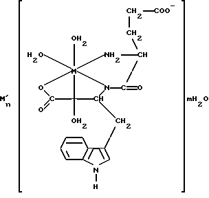 Пример 1. 1,0031 г (0,003 моль) глутамилтриптофана и эквивалентное количество соли металла (0,7179 г МnSO4 4Н2О, 0,7138 г СоСl2 6Н2О, 0,7134 г NiCl2 6H2O, 0,7486 г СuSO45Н2О или 0,8621 г ZnSO4 7H2O) раздельно друг от друга каждые растворяют в 50 мл бидистиллированной воды при комнатной температуре. Растворы в случае необходимости фильтруют и затем сразу же объединяют. К раствору прибавляют два эквивалента щелочи NаОН (или КОН, LiOH), выливают в 100 мл безводного ацетона, который охлаждают смесью льда и поваренной соли. Осаждается хорошо отстаивающийся осадок, который быстро отсасывают на охлаждаемом стеклянном фильтре с сильным вакуумом. Полученное вещество сушат в вакуум-эксикаторе над фосфорным ангидридом. После повторных несколько раз отсасываний вещество медленно кристаллизуется, а затем его измельчают в порошок. Получают следующие выходы,%: Мn-комплекс 75, Со-комплекс 85, Ni-комплекс 80, Си-комплекс 80, Zn-комплекс 70.