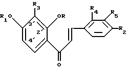 Соединения данного изобретения могут преимущественно вводиться перорально или посредством вливания; для перорального введения природные или синтетические фосфолипиды оказываются особенно полезными, так как образуют стабильные липорастворимые комплексы с хальконами; доказано, что триглицериды с углеродной цепью средней длины и родственные наполнители являются полезными. Дозировки соединений данного изобретения, главным образом вводимые перорально, могут изменяться в широкой области, например, от 10 до 300 мг/день.