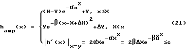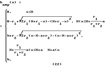 Такие трансформаторы, как цилиндрическо-конический или цилиндрическо-катеноидальный, не имеющие выраженных концентраторов напряжений, то есть, обладающие высоким запасом прочности, в то же время не обладают высокой относительной трансформацией. Коническо-цилиндрический и ампульно-цилиндрический, наоборот, обладая достаточным , имеют сильные концентраторы напряжений в местах особых точек, которые можно считать участками с положительной кривизной и бесконечно малым радиусом кривизны. Для канонического ступенчатого трансформатора, который но совокупности признаков также можно отнести к данному классу, * вообще имеет нулевое значение. Галтельные трансформаторы могут изменять фактор качества в широком диапазоне в зависимости от радиуса галтели r, наиболее используемые значения для которого 0,6-0,8(H – h) [2]. Оценка волноводных акустических трансформаторов по критерию “относительного фактора качества” позволяет сделать вывод о том, что установление противоположно-экстремальных значений радиусов кривизны на соседствующих участках функции профиля с разными знаками кривизны приводят к одному и тому же результату – снижению *.Исходя из этого, становится ясно. что оптимум находится в области акустических трансформаторов с гладкими функциями профиля, резко изменяющими абсолютное значение на сравнительно коротком диапазоне аргумента. Следующим классом акустических волноводных трансформаторов являются трансформаторы, функция профиля которых представляет из себя аналитическую на всем диапазоне их длины, кусочно-гладкую, непрерывно дифференцируемую функцию, составленную из конгруэнтных в точках сопряжения фрагментов и обладающую не менее, чем однократно изменяющимся знаком кривизны. Известный пример таких трансформаторов – ампульный (по Э. Эйснеру), составленный из последовательно сопряженных функций положительного аргумента, как минимум одна из которых является гауссовой функцией [6]. Трансформаторы этого класса обладают высокими значениями *. Общее выражение для функции “эйснеровского” профиля трансформатора при априорном выборе параметров может быть представлено, например, в виде двух последовательно сопряженных гауссовых функций:![]() где , – независимые переменные (параметры);Y – ордината асимптоты первого фрагмента функции; поправка к ординате максимума второго фрагмента функции, обеспечивающая гладкое сопряжение;X – абсцисса точки сопряжения; X- поправка к абсциссе точки сопряжения, обеспечивающая гладкое сопряжение;с 0,01 – значение первой производной функции профиля в точке сопряжения, практически удовлетворяющее условию конгруэнтности и признакам, изложенным в [6].