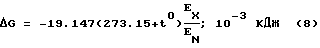Ввиду протяженности поры условно цилиндрического сечения вводят коэффициент 4 , и для разности давлений p выражение принимает вид:![]() Измеренный таким образом потенциал течения позволяет однозначно констатировать образование гидрофильного ИГС по его толщине, превышающей толщину ДЭС, потенциал которого определяется по уравнению Нернста. Разбавлением исходного раствора на порядок получают нормированное (приведенное к единице) значение потенциала течения. Такое значение следует из условия автонормировки для десятичного логарифма перед отношением активностей (концентраций). После нормировки получают выражения, аналогичные для нернстовского потенциала: EX~ ~CX; EN~ N~CN (5),где EX – текущее измеряемое значение ЭДС, ЕN – нормированное значение ЭДС до начала опыта. EX/EN = X/ N = lg[CX/CN] (6)С учетом соотношения СX/СN=10 из условия автонормировки (lg10=1) следует равенство коэффициента перед Na, аналогичного изменению мольной доли X, выражению ЕX/ЕN, из которого в свою очередь однозначно следует возможность применения ЕX, ввиду фиксированного значения EN, в качестве показателя изменения суммарного количества носителей заряда в жидкой фазе в процессе их адсорбции на пористой среде. Изложенный подход позволяет использовать стандартные выражения для энергии Гиббса (изобарно-изотермический потенциал) и энергии активации: G = -RTlnK (7),где G – изменение изобарно-изотермического потенциала (энергии Гиббса),R – универсальная газовая постоянная, Т – заданная абсолютная температура, К – константа равновесия. Энергию активации можно также вычислить из непосредственного соотношения констант скоростей, минуя определение концентрации в какой-либо форме. С учетом стандартных условий, созданных в начале эксперимента, следует, что потенциал течения в данном случае будет непосредственно зависеть от адсорбции ионов и может быть назван потенциалом адсорбции (создания ионно-гидратного слоя). ![]() Энергию активации находят по формуле. ![]() “Комбинированным” подходом возможно отыскание непосредственных переходных коэффициентов между методами концентрационной цепи и потенциалом течения. Что касается “изобретательского уровня”, то соответствие ему заявляемого технического течения определяется тем, что для определения гидрофобизирующих свойств химреагентов по отношению к пористой среде используется “потенциал течения”, определяемый в системе “раствор-реагент-пористая среда” с помощью электрохимической системы “открытого” типа, имеющей “рабочую” и “приемную” емкости, между которыми создается перепад давления. “Неожиданность” технического решения по предлагаемому способу заключается в том, что непосредственное измерение разности потенциалов между “рабочей” и “приемной” емкостями при фильтрации жидкости через образец пористой среды, разделяющей емкости, позволяет определить термодинамические и кинетические параметры процесса гидрофобизации гидрофильной поверхности пористой среды. В противоположность прототипу заявляемый способ поддается автоматизации путем контроля процессов адсорбции и десорбции электроактивных компонентов ионно-гидратного слоя в форме записи электрического сигнала самопишущим прибором или осциллографом, непосредственно подключенным к выходу электрометра, измеряющего разность потенциалов между “рабочей” и 