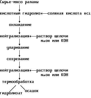 Биологически активную добавку получают путем кислотного гидролиза, нейтрализации, упаривания, созревания, нейтрализации, термообработки и отделения осадка по нижеприведенной схеме:![]() Выбранные приемы и режимы оптимальны для получения биологически активной добавки с совокупностью признаков, идентифицирующих данный продукт, отличный от аналогов. Примеры осуществления способа. Пример 1. Мясо рапаны извлекают из раковины любым известным способом, например термообработкой. Затем мясо загружают в реактор, куда добавляют соляную кислоту до концентрации в гидролизуемой массе 6,5%. Гидролиз ведут при температуре 105,5oC в течение 15 ч до содержания аминного азота в гидролизате 0,8%. Массу охлаждают до температуры 40oC и нейтрализуют раствором щелочи (NaOH или КОН) до рН 5,0. Массу упаривают для удаления избытка влаги до плотности не более 1,3 г/см3 и оставляют для созревания, выдерживая в течение 7 дней. По окончании проводят повторную нейтрализацию до рН 5,5. Далее массу нагревают до температуры 80oC и фильтруют на фракции. Фракцию – осадок сбрасывают, а гидролизат направляют на фасование. Хранят при температуре 0-25oC. Пример 2. Способ проводят аналогично примеру 1, за исключением некоторых показателей проведения гидролиза. Кислотный гидролиз ведут в течение 10 ч, выдерживание после упаривания в течение 8 дней. Гидролизат перед фильтрованием нагревают до температуры 60oC. Формула изобретения