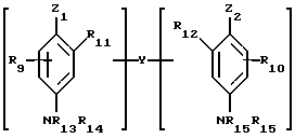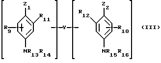 Из числа двойных оснований, пригодных для использования в качестве окисляемых оснований в красящих композициях по изобретению, могут быть, в частности, названы соединения, соответствующие приведенной ниже формуле III, и их солевые аддукты с кислотами:![]() в которой Z1 и Z2, одинаковые или разные, обозначают радикал гидроксил или -NH2, которые могут быть замещены С1-С4-алкилом или связкой Y; связка Y обозначает линейную или разветвленную алкиленовую цепь с 1-14 атомами углерода, которая может быть прервана или завершена одной или несколькими азотсодержащими группами и/или одним или несколькими гетероатомами, такими как кислород, сера или азот, и возможно замещена одним или несколькими гидроксильными или C1-С6-алкокси- группами; R9 и R10 обозначают атом водорода или галогена, С1-С4-алкил, моногидрокси-С1-С4-алкил, полигидрокси-С2-С4-алкил, амино-С1-С4-алкил или связку Y; R11, R12, R13, R14, R15 и R16, одинаковые или разные, обозначают атом водорода, связку Y или С1-С4-алкил; при условии, что соединения формулы III содержат только одну связку Y на молекулу. Из числа азотсодержащих групп в приведенной выше формуле III могут быть, в частности, названы группы амино, моно-С1-С4-алкиламино, ди-С1-С4-алкиламино, три-С1-С4-алкиламино, моногидрокси-С1-С4-алкиламино, имидазолиниевая и аммониевая. Из числа двойных оснований приведенной выше формулы III можно, в частности, выделить N, N’-бис( -гидроксиэтил)-N,N’-бис(4′-аминофенил)-1,3-диаминопропанол, N,N’-бис( -гидроксиэтил)-N,N’-(4′-аминофенил)этилендиамин, N, N’-бис(4-аминофенил)тетраметилендиамин, N, N’-бис( -гидроксиэтил)-N, N’-бис(4-аминофенил)тетраметилендиамин, N,N’-бис(4-метил-аминофенил)тетраметилендиамин, N, N’-бис(этил)-N, N-бис(4′-амино-3′-метилфенил)этилендиамин, 1,8-бис(2,5-диаминофенокси)-3,5-диоксаоктан и их солевые аддукты с кислотами.